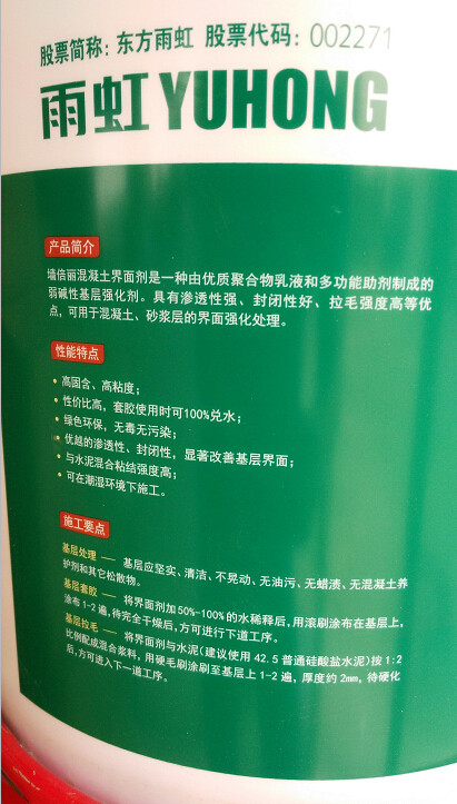 Интерфейсная агент Wall Bei Li (обработка бетона интерфейса) представляет собой новый тип материала с высокой прочткой, состоящий из полимерной эмульсии и многофункционального вспомогательного агента.Он имеет характеристики хорошего закрытия, сильной проницаемости и высокой прочности волос, и подходит для раздела, обработка бетонных и растворов.