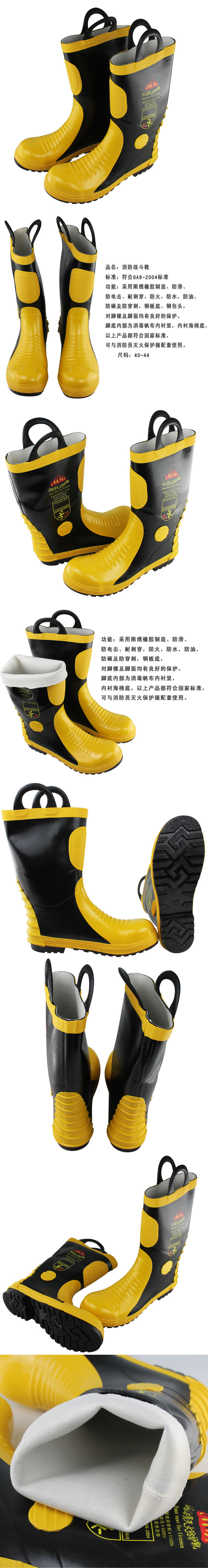 Функция: он изготовлен из огнестойковой резины, анти -стеклополосной, антиэлектрической удары, пирсинговой сопротивления, профилактики пожара, водонепроницаемой, нефтяной, анти -смашной и пункции, дна стальной пластины, стальных малышей и хорошей защиты для обнаженных ног и ноги.Внутренняя часть ног - внутренняя подкладка холста и дно морского хлопка. Вышеуказанные продукты соответствуют национальным стандартам, которые можно использовать с пожарными, которые пожарные, предлагающие униформу защиты.