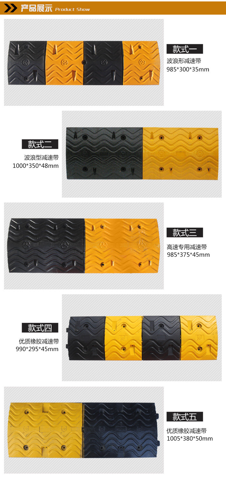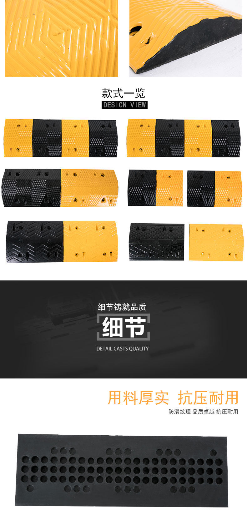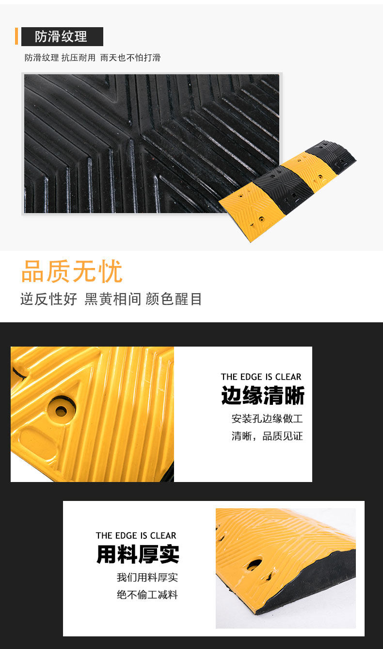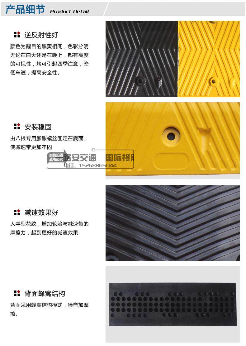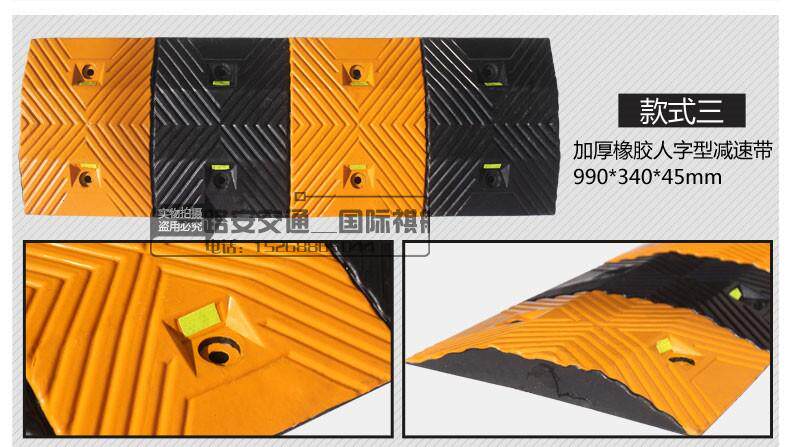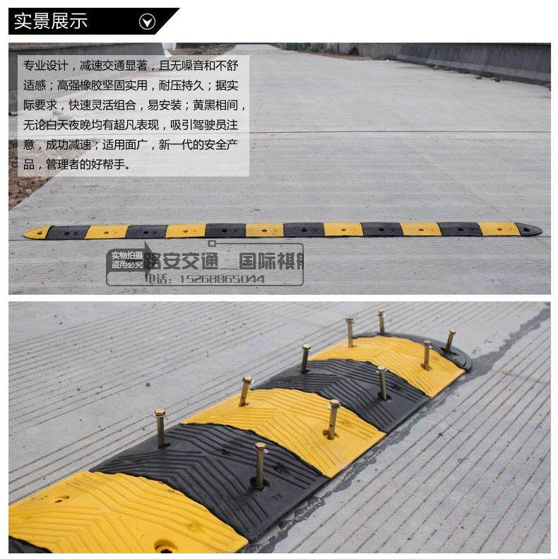 Функции:1. Дизайн, существует значительная эффективность замедления, без шума и дискомфорта;2. Сильный и практичный, долговечный для давления;3. Фактические требования, быстрая и гибкая комбинация, простая в установке;4. Черные и желтые, есть необычные выступления днем и ночью, привлекая внимание водителей и успешное замедление; 5. Лица Wide, новое поколение продуктов безопасности, хороших помощников менеджеров.