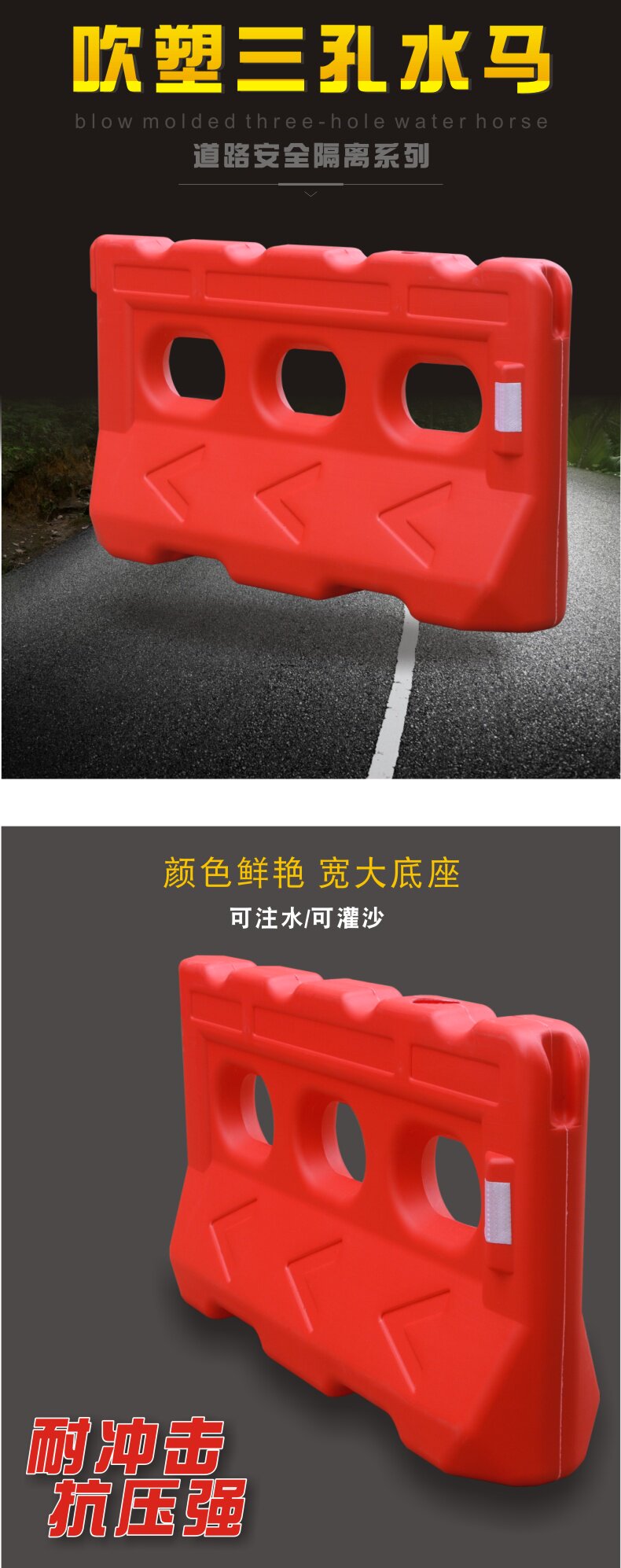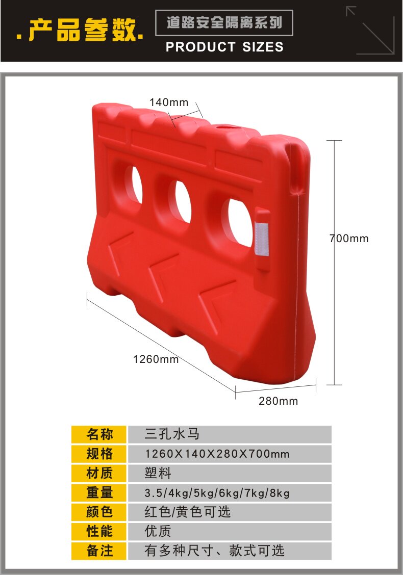 Выдуваемая пластиковая трех -ярко -яма Водяных лошадей Пластиковый пирс может переместить забор Муниципальные пластмассы, блокирующие отражение трафика против бочки с Collision