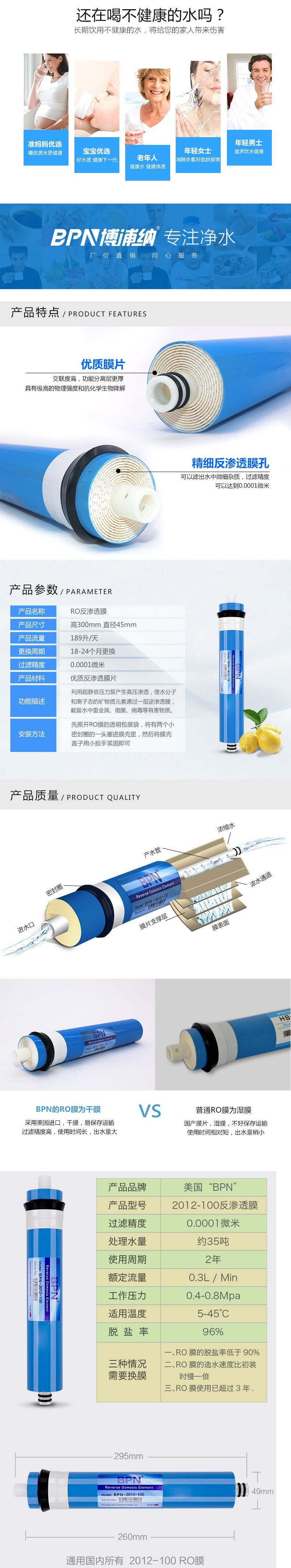Универсальная мембрана осмоса RO обратного осмоса 1812-75 г/2012-100 г дома 10-дюймовый элемент очистки воды для очистки воды.