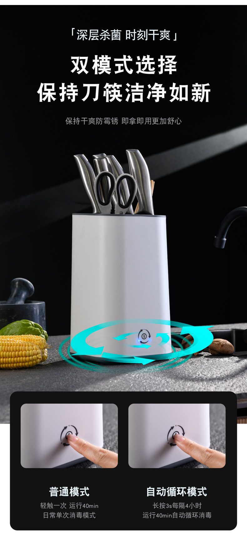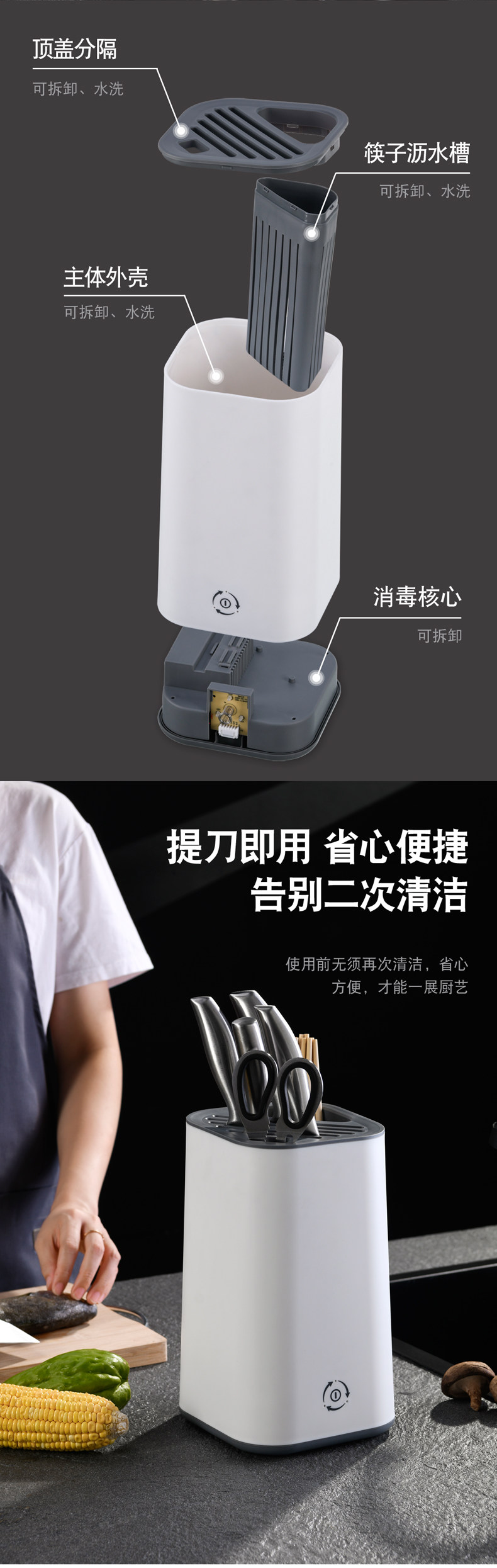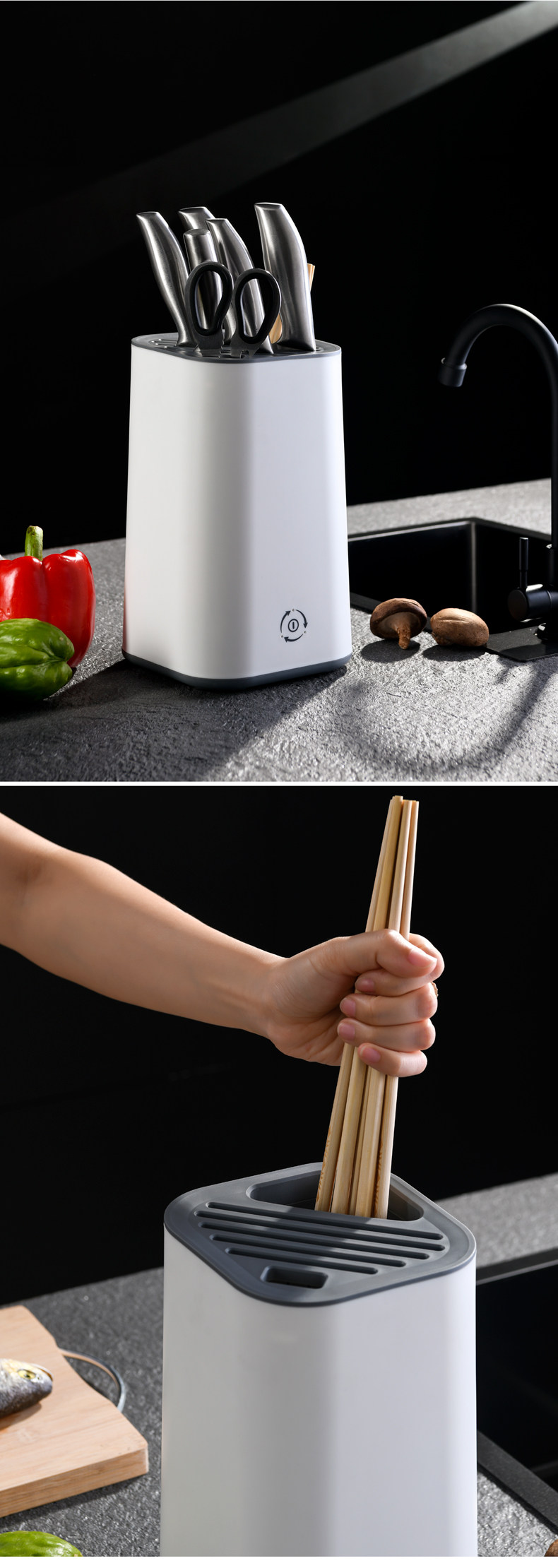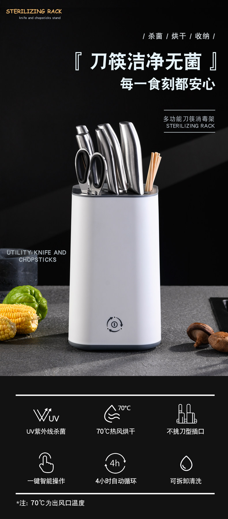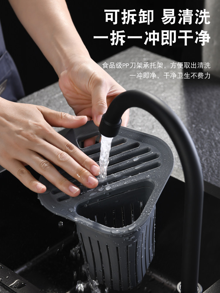 Дезинфицированная стойка для ножа, помещенная на лезвие, кухонные принадлежности в сочетании с палочками для еды, домохозяйством в доме
