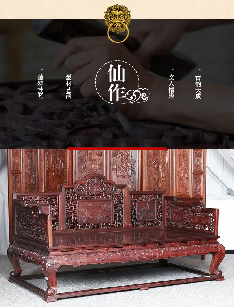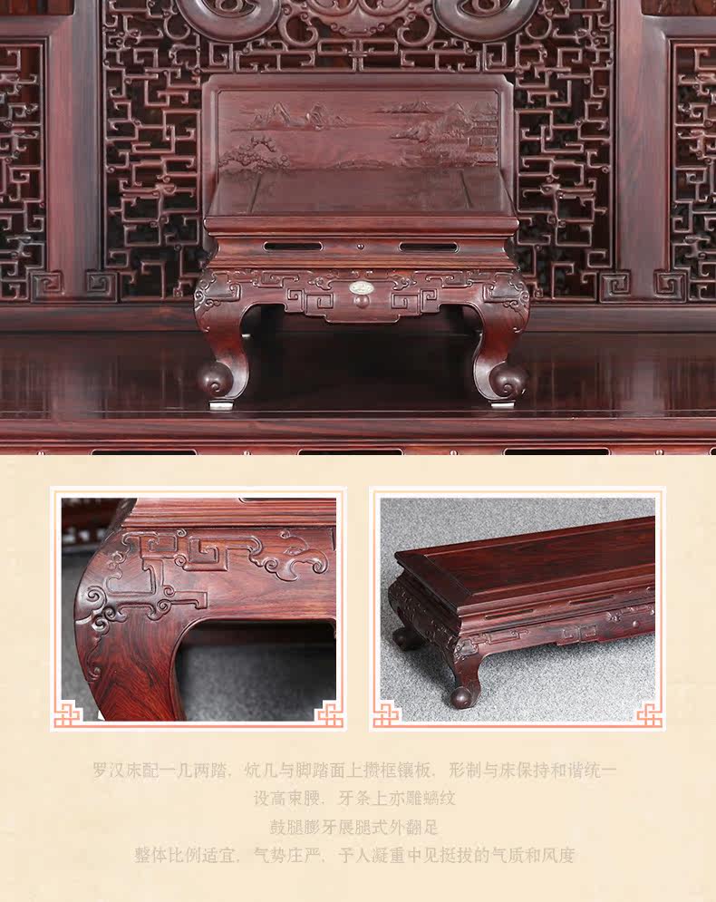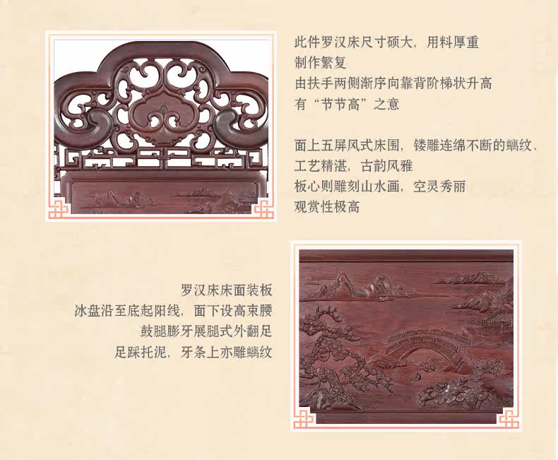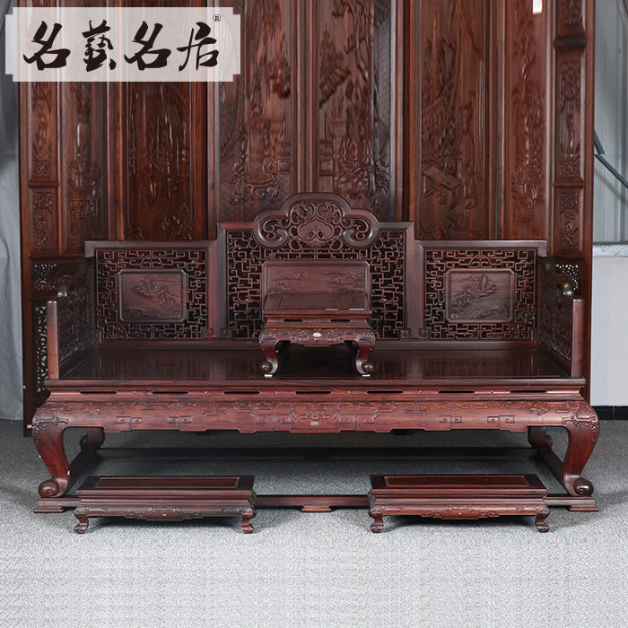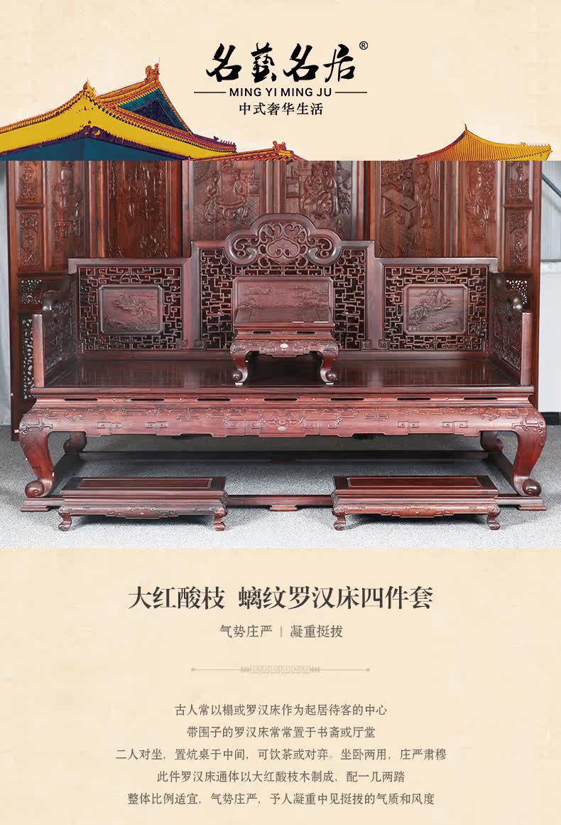名艺名居 Большой красный розовый дерево, лента, кровать Luo Han Four -Piece 雕 大 艺 Классическое исследование мебели из красного дерева