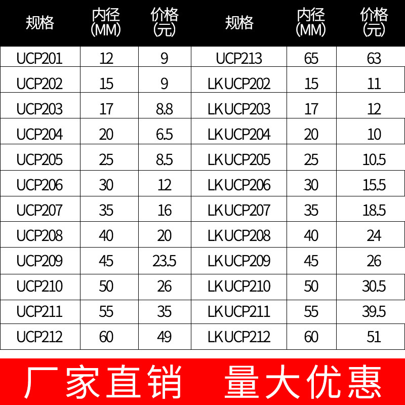 | Цвет: | UCP201 [внутренний диаметр 12], UCP202 [внутренний диаметр 15], UCP203 [внутренний диаметр 17], UCP204 [внутренний диаметр 20], UCP205 [внутренний диаметр 25], UCP206 【внутренний диаметр 30】, UCP207 [внутренний диаметр 35], UCP208 【внутренний диаметр 40】, UCP209 【внутренний диаметр 45】, UCP210 【внутренний диаметр 50】, UCP211 【внутренний диаметр 55】, UCP212 【внутренний диаметр 60】, UCP213 【внутренний диаметр 65】, Прозрачный UC204 [отдельные подшипники, LK ухудшается UCP202, LK ухудшается UCP203, LK Ухудшается UCP204, LK ухудшается UCP205, LK ухудшается UCP206, LK Warsen UCP207, LK ухудшается UCP208, LK ухудшается UCP209, LK ухудшается UCP210, LK ухудшается UCP211 |
