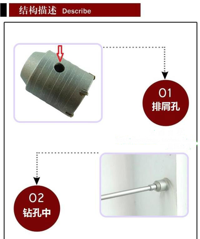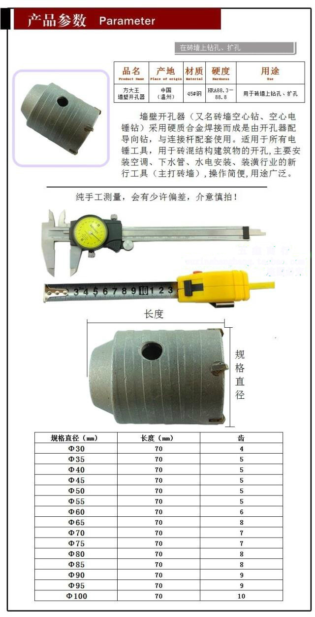 Технические характеристики настенных отверстий изготовлены из 30 мм до 100 мм, а устройство открытия стены стены приварено жестким сплавом (также известным как кирпичная настенная алмаз, использование электрического молотка полого проникновения настенного бриллианта).Это подходит для всех инструментов электрического молотка.Основная кирпичная стенаК.Стержень подключения полого электрического молотка выбирается в соответствии со структурой передней ручки (обязательно выберите ручку, которая соответствует вашему электрическому молотку при покупке). Длина определяется в соответствии с потребностями пользователя.