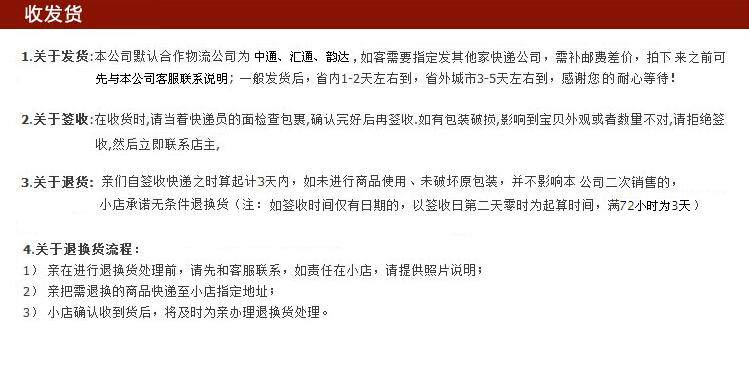 7.Перед выпуском всех продуктов этого магазина он был протестирован, что абсолютно гарантировало, что товары не повреждены.После получения товара покупатель должен проверить товары перед сотрудниками грузовой компании. Если он поврежден, позвольте персоналу выпустить“ доказательство ущерба&Rdquo; и затем вернул товары через грузовую компанию, и наш магазин отвечал за его замену.Если замена и возврат товаров после подписания подписаны, наш магазин не будет возвращен.Спасибо за ваше сотрудничество!ПересечениеПересечение