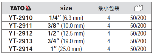 | Цвет: | YT-2910 1/4", YT-2911 3/8", YT-2912 1/2", YT-2913 3/4", YT-2914 1" |