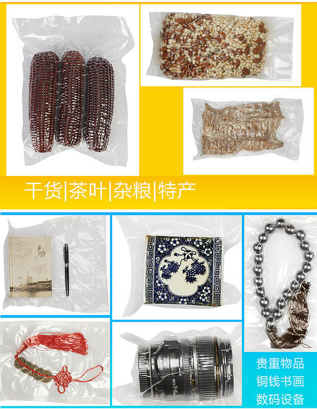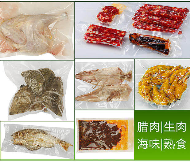 Сумки: рот был запечатан с трех сторон, а размер зафиксирован. После того, как пища помещается в сумку, воздух уплотняет непосредственно без разрезания.Есть легкие разрывы.