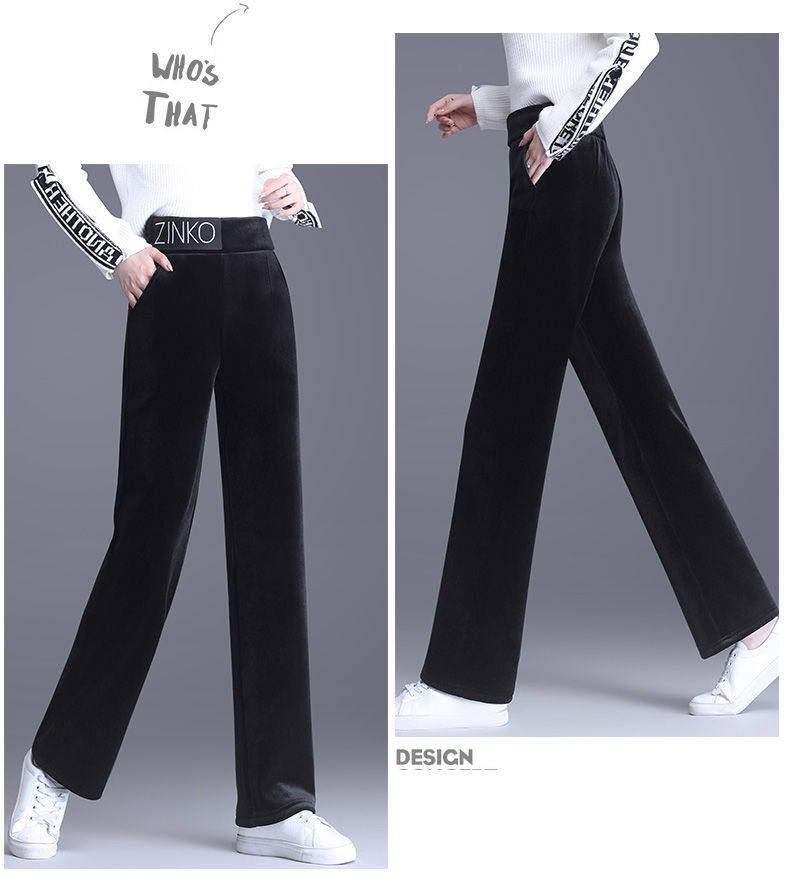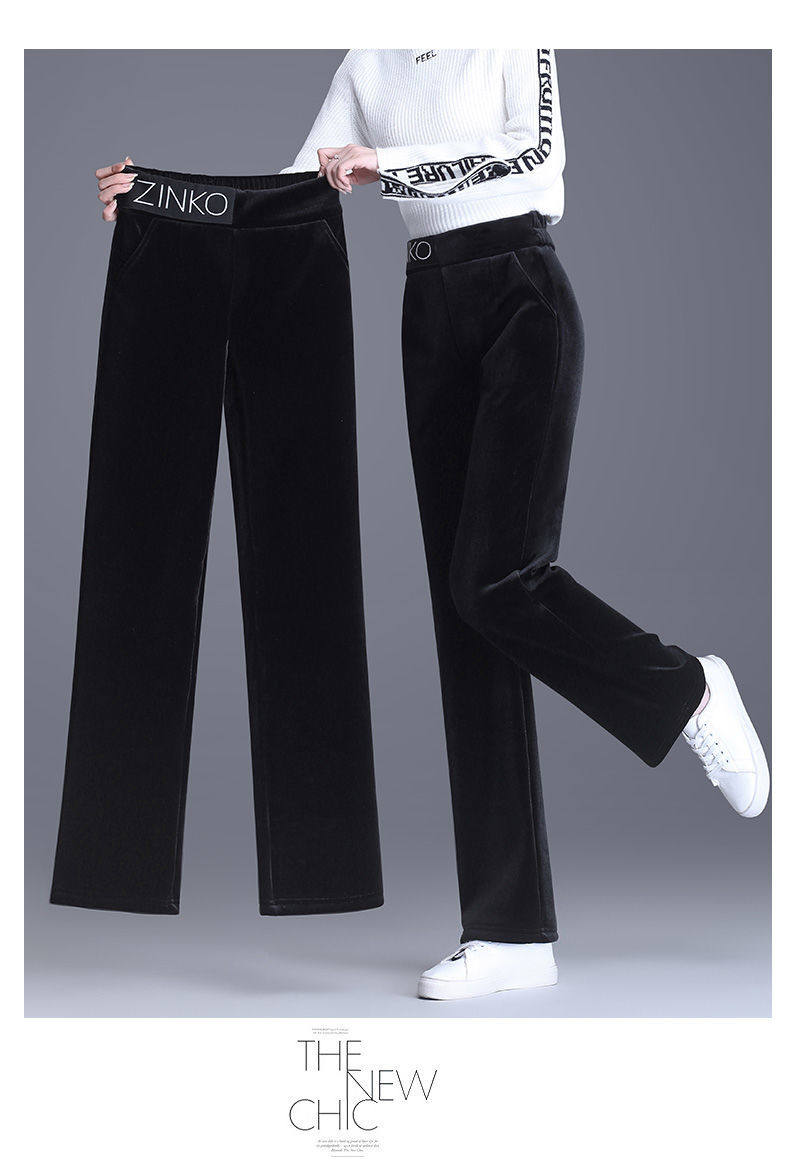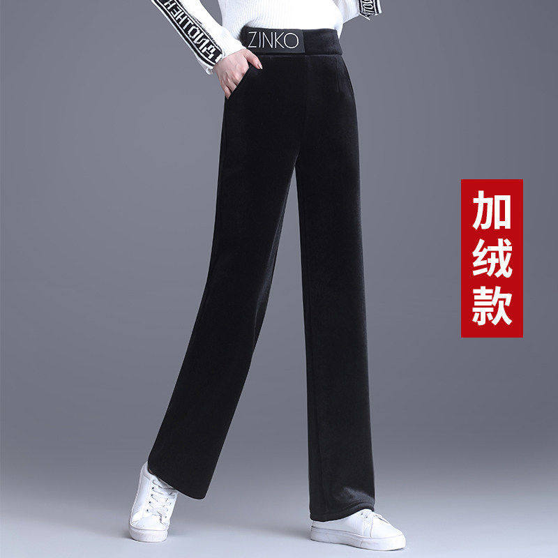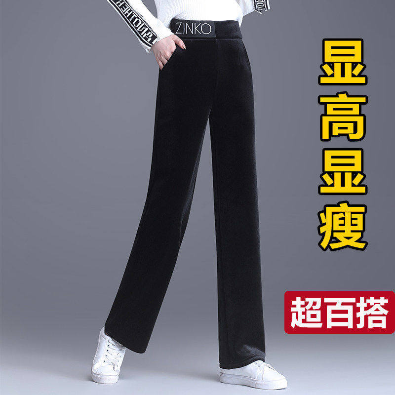 Утепленные бархатные черные штаны для отдыха, коллекция 2021, высокая талия, свободный прямой крой