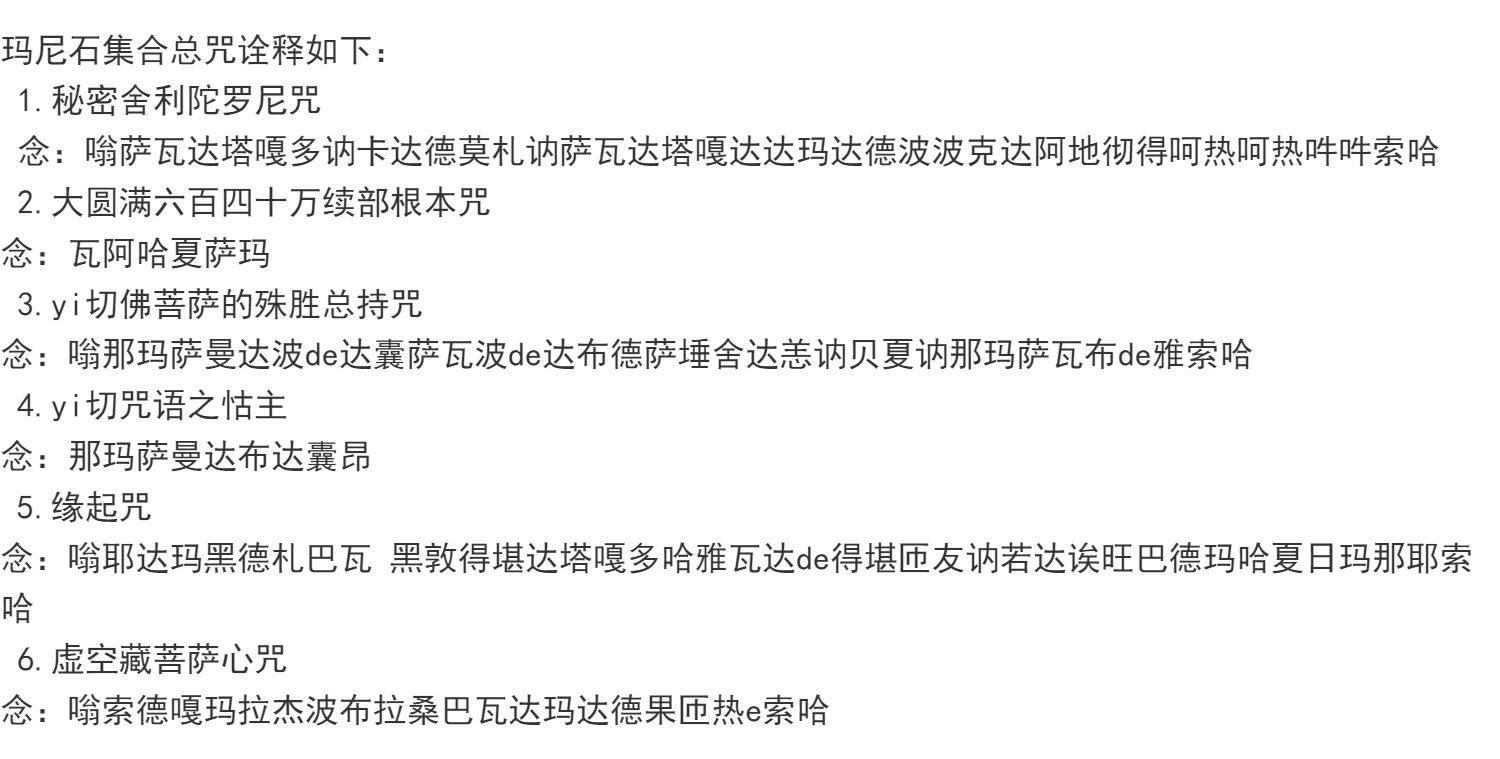 Мантра зависимого происхождения, Мантра сердца бодхисаттвы Сокровище Пустоты, Тайная Дхарани, Великое Совершенство, Отдел полной непрерывности, Фундаментальная мантра, Камень Мани