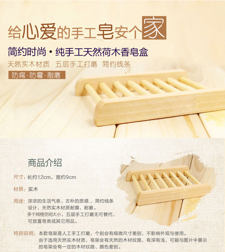 Уникальный дизайн стиля может сохранить мыло сухим и сделать его более способным к долгосрочному сохранению мыла.Натуральное дерево жестко, имеет сильную устойчивость к давлению, нелегко деформировать, нелегко поглощать влагу и ухудшаться. Деревянная текстура мыльной коробки ясна, стиль модный и красивый, а мыльная коробка обладает сильной водостойкостью.Гладкий и прочный, легко чистый.Это удобный дом для мыла.