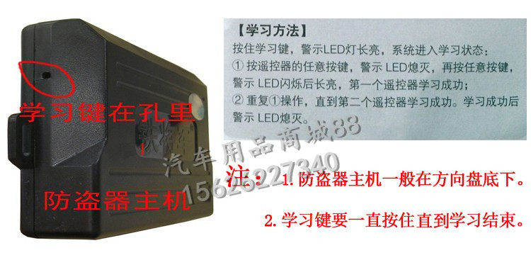※Метод обучения: изучить два пульта дистанционного управления; нажмите и удерживайте обучающую клавишу (в маленьком отверстии на стороне хоста) светодиодным и ярким.Нажмите любые клавиши на пульте дистанционного управления, светодиод блестящий, а затем нажмите любой из пульт дистанционного управленияв соответствии сКлюч, первый пульт дистанционного управления завершен;Не сосна обучает ключиУзнайте второй пульт дистанционного управления в соответствии с вышеуказанным методом.После учебы.(Хозяин может только учитьсядваЭффективный пульт дистанционного управленияПолем