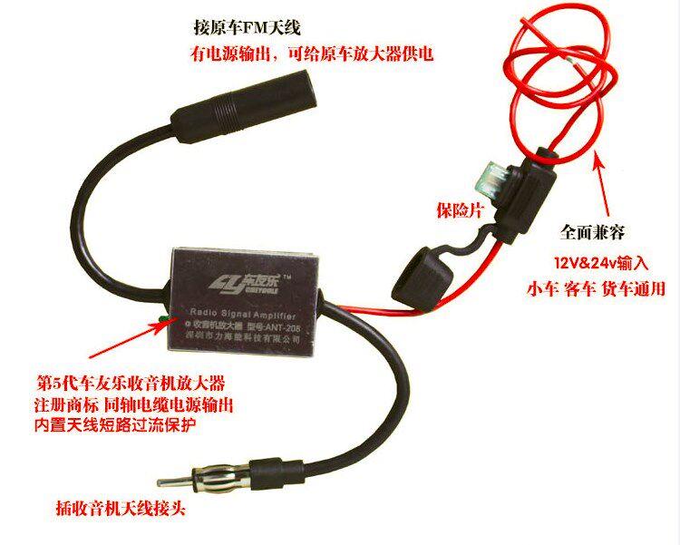 Черная линия подключена к отрицательному электроду источника питания,Красная линияПодключите положительный полюс питания 12 В,Вставьте усилитель между радио и антенной, не изменяя исходный маршрут автомобильной антенны, установка проста и удобна.Не нужно менять линию.