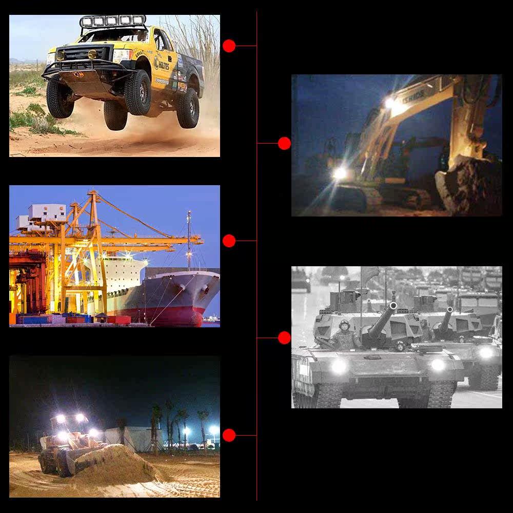 Этот тип ксеноновых рабочих фар широко используется в различных транспортных средствах и в настоящее время широко используется в некоторых крупных транспортных средствах, таких какИнженер(Экскаваторы, лесорубы, дорожные катки, бульдозеры, краны, карьерные самосвалы, сельскохозяйственная техника, машины скорой помощи, вилочные погрузчики),Специальная машина(пожарные машины, полицейские машины, машины скорой помощи, машины связи, машины аварийного командования, электрические аварийно-ремонтные машины, машины аварийно-ремонтной связи),Внедорожник, освещение для квадроциклов и других транспортных средств, а также промышленных и горнодобывающих объектов, патрульное и другое специальное или мобильное освещение окружающей среды.