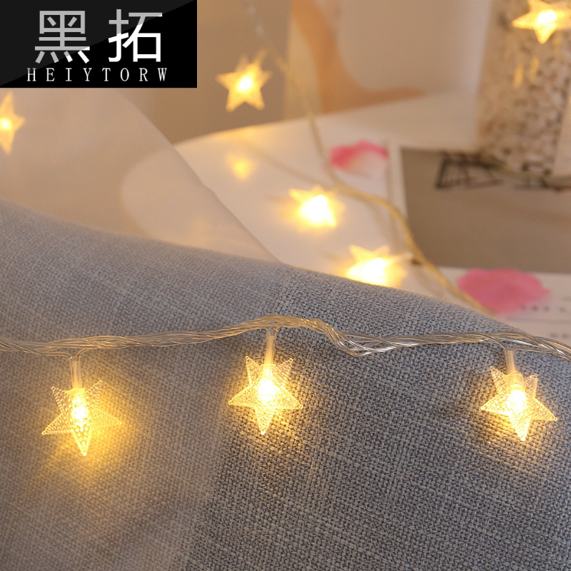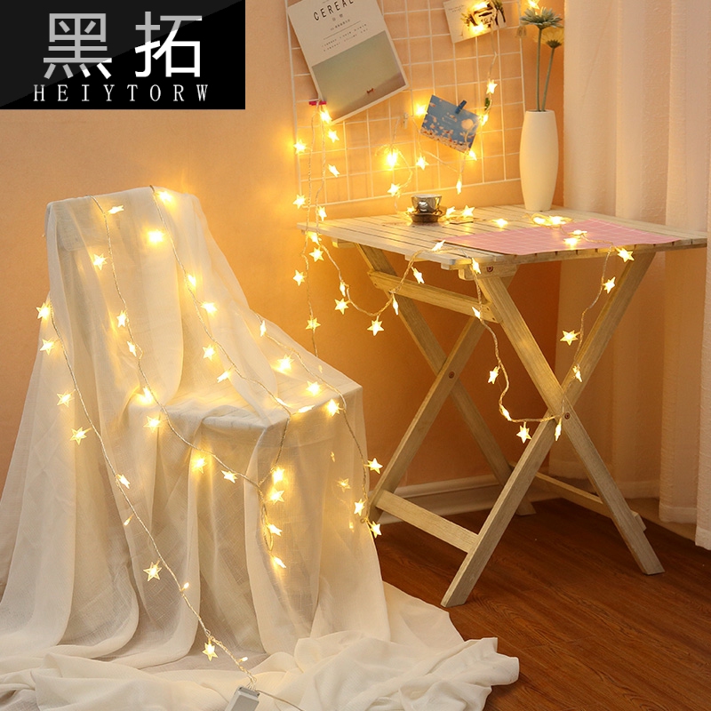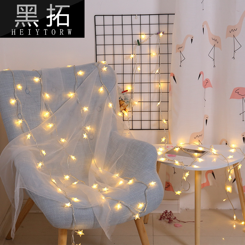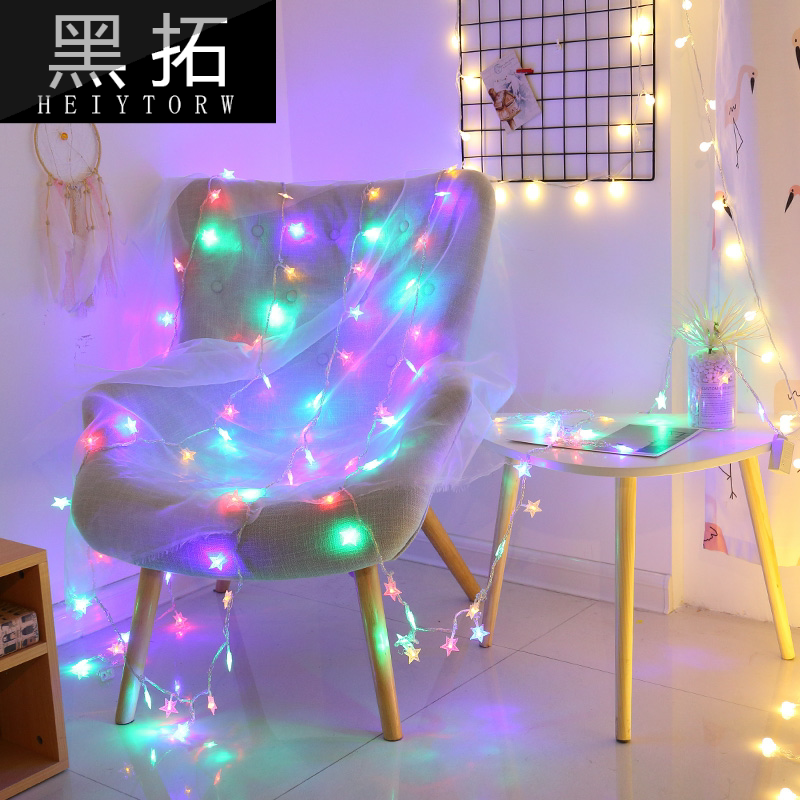 .Интернет-планировка спальни знаменитости, украшения комнаты, маленькие красочные огни, мигающие гирлянды, полные звезд, красочная девушка, меняющая цвет