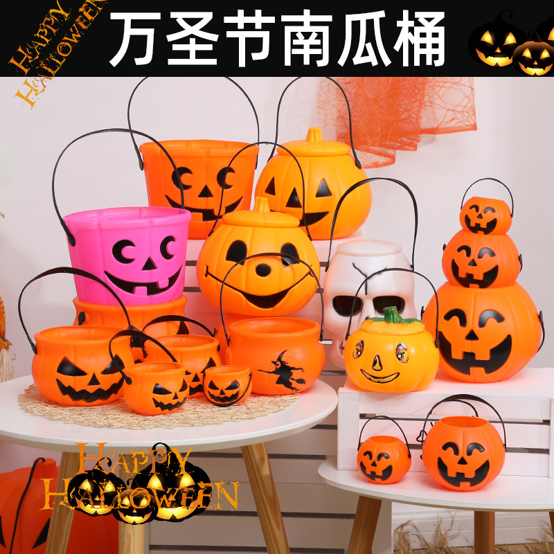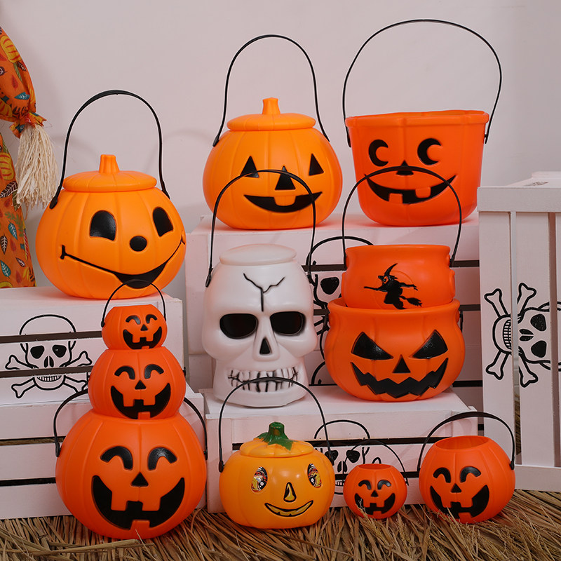 Тыквенная лампа Хэллоуин с тыквенной бочкой детской рукой с рукой с легкой тыквой тыквенной банки пластиковая конфеты предметы