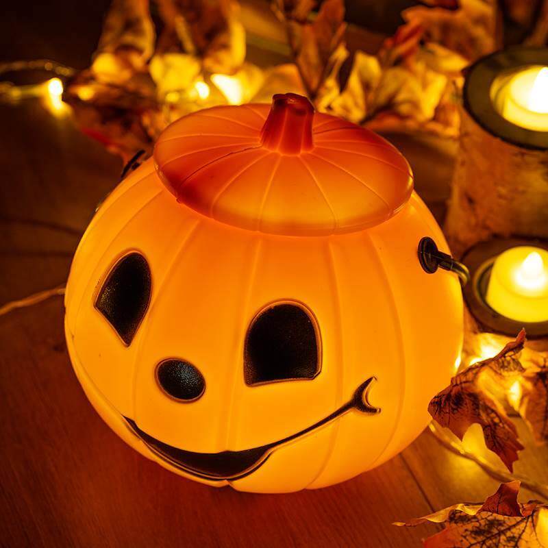 Хэллоуин фонарь фонарь Наньоу играет реквизит и фруктовые банки с ручной корзиной, чтобы обсудить сахарную пакет тыква и декоративный сахар