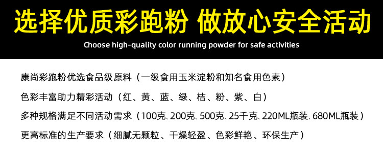 Цветовой бегущий порошок соответствует стандарту пищевого сорта, бегущий порошок Kang Shangcai является сухим и легким, нежным (выше 180), цвет яркий, распыляемый равномерный, а эффект активности хорош.