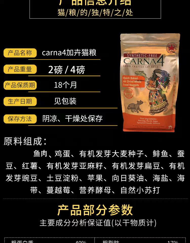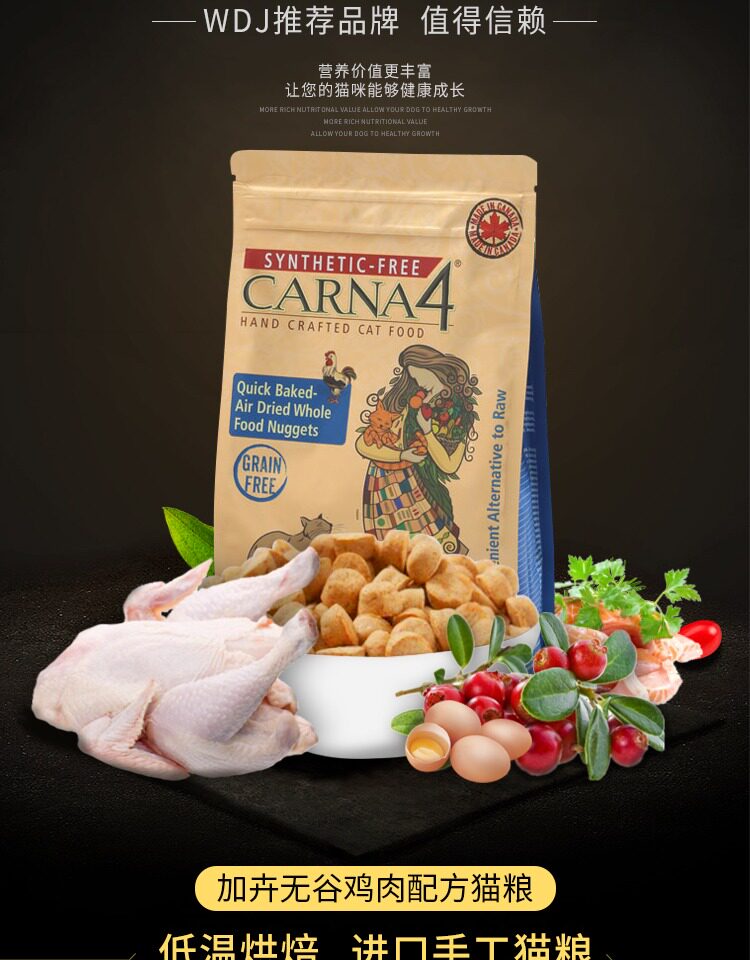 Jiahui Spot Canada Carna4 Cat Food плюс натуральное низкоэлементное жареные зерна без долины курица 2 фунта 4 фунта