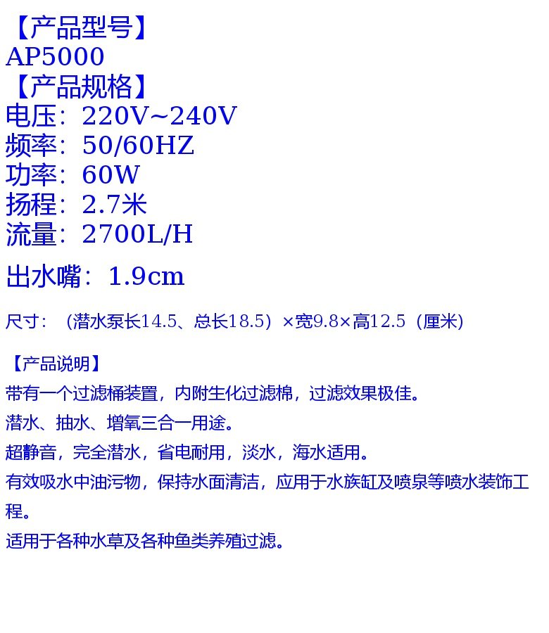 Zhenhua Jiabao Strong AP5000 Многофункциональный погруженный насос рыбная рыба еместная насоса насос 60 Вт/2800 л.