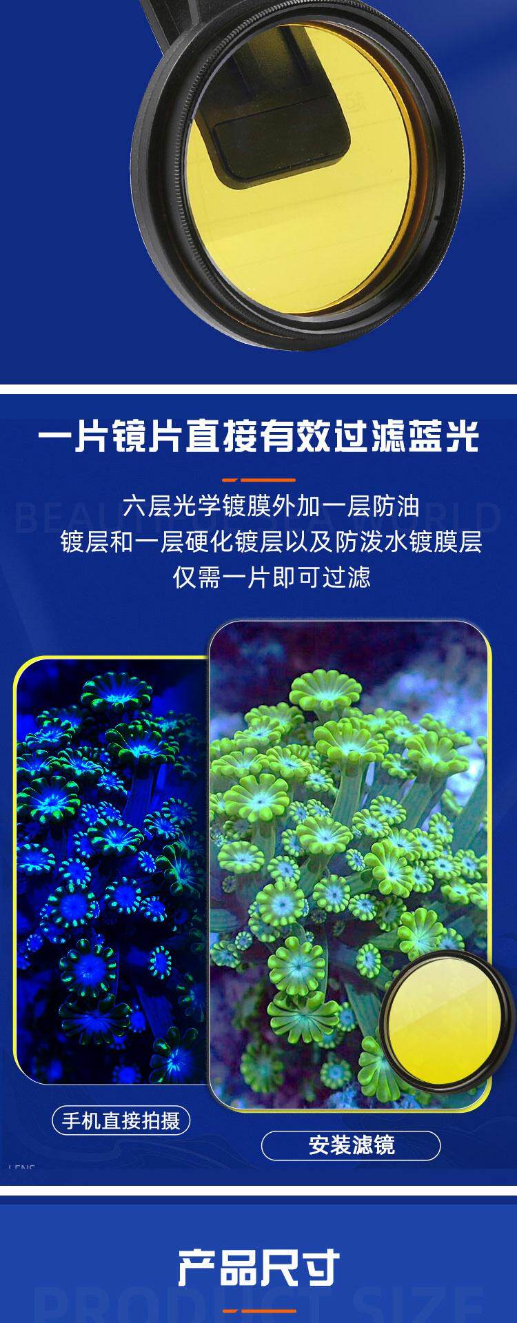 Улучшенный фильтр основан на стандартном фильтре, в сочетании со спектром чистого синего света Yingmoqi/XR/AP на рынке, а также спектром чистого синего света домашних ламп и миконг, и добавил четыре слоя покрытия на оригинальную линзу, так что цвет флуоресцентного кораллов под синим светом может быть лучше выстрелом при съемке на мобильном телефоне!Улучшенный фильтр делится на 52 -мм и 67 -миллиметровые пакеты фильтров (без зажимов, используемых с SLR и чехлами для мобильных телефонов на рынке, которые могут быть установлены с помощью фильтров)