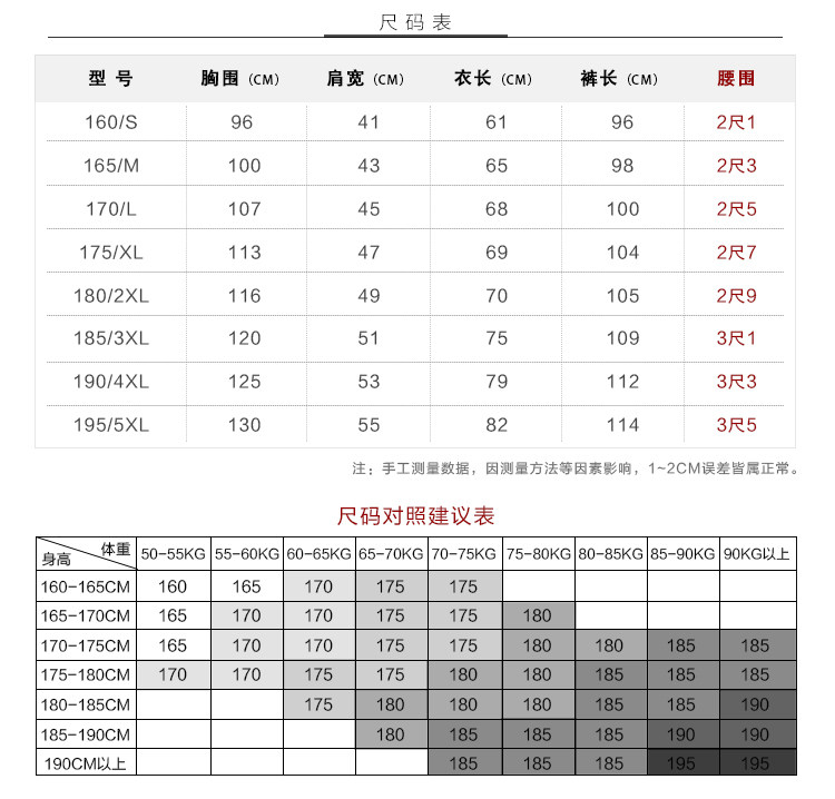 | Размер: | S [160 предложение 95-105 Catties], М [165 Предложение 105-120 Catties], L [170 рекомендуется 120-135 котлих], XL [175 Предложение 135-150 Catties], 2xl [180 предложение 150-165 Catties], 3xl [185 Предложение 165-180 Catties], 4xl [190 подходит для 180-195 котлетов] |