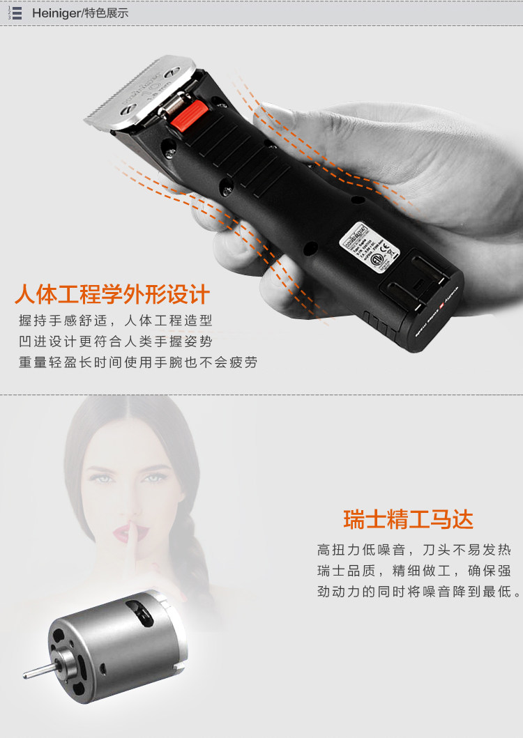 беспроводная покупка один получен четыре: подарочная база, зарядное устройство, смазочное масло, чистящая кисть! Бренд: Швейцарский Heiniger (Hennig) Power 35W использует напряжение 100-240V  напряжение батареи 7,4 В  питание аккумулятора: 1600 мАч самостоятельно 10 ножей головы