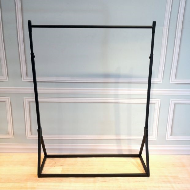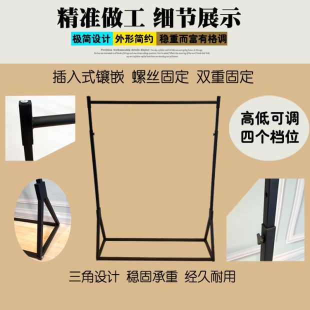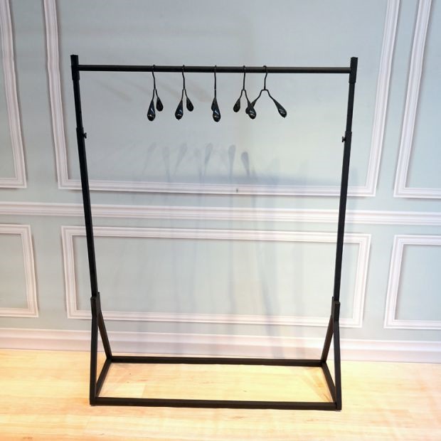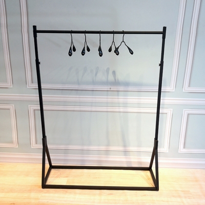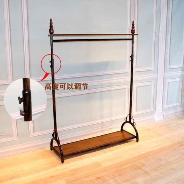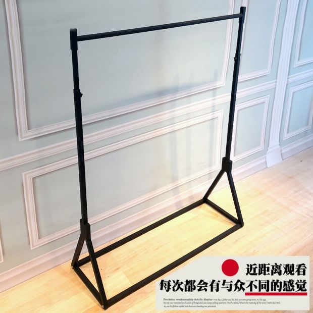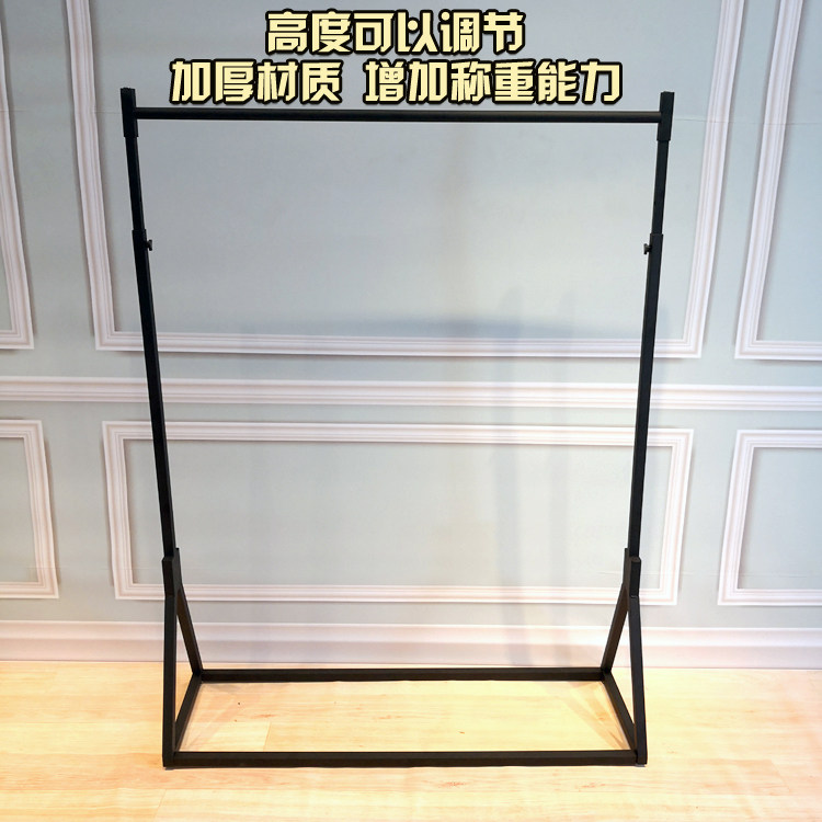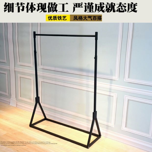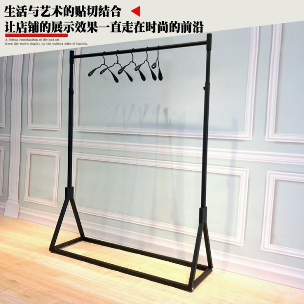 В магазине одежды показывается железная стойка в стиле -напольный пол -навесные полки женскую одежду на стену подвесной высоты вешалки и регулируемой одежды.