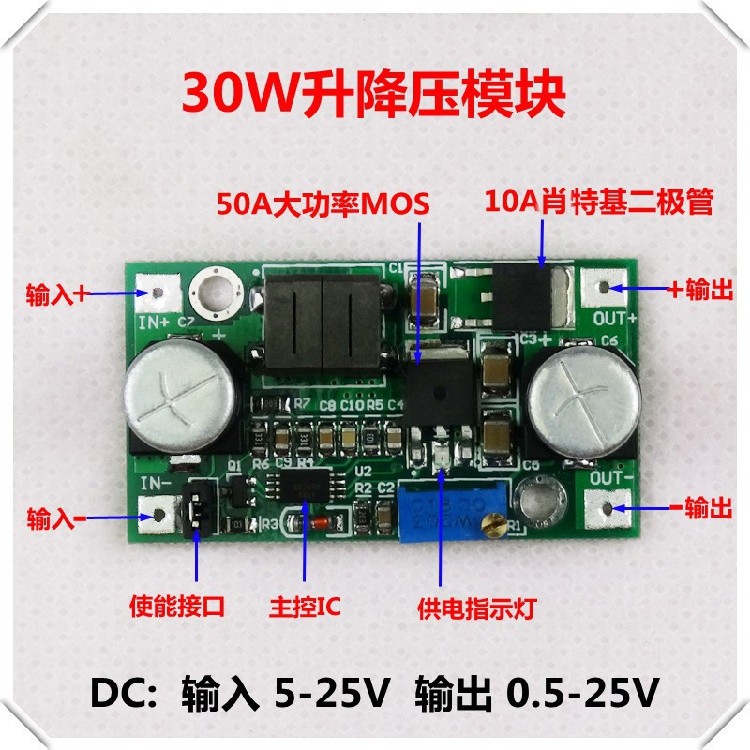 - Напряжение напряжения высокого напряжения высотой 30 Вт имело нисходящее модуль, производительность намного превышает LM2596 и LM2577. Выходное напряжение может быть выше или ниже входного напряжения.