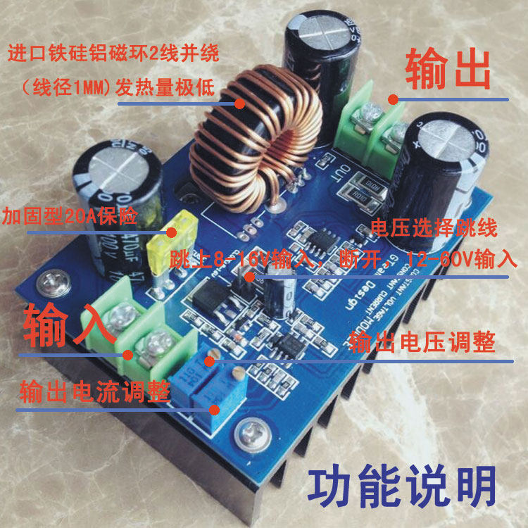 Проводится конструкция негабаритного радиатора (85 мм*62 мм*высота 64 мм), и выполняется черная обработка окисления (отличный эффект диссипации черного окислителя является превосходным).Поддержка широкого входного напряжения 12-60 В, 12-80V может отрегулировать широкое выходное напряжение и разницу в выходных напряжениях в входном входном уровне.