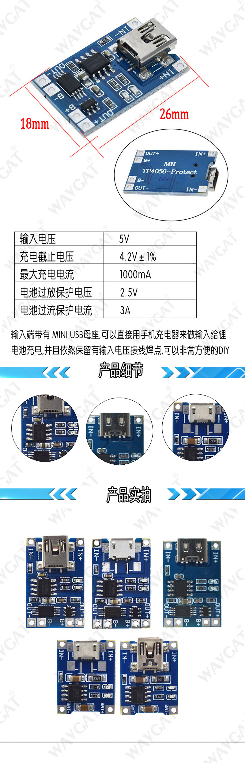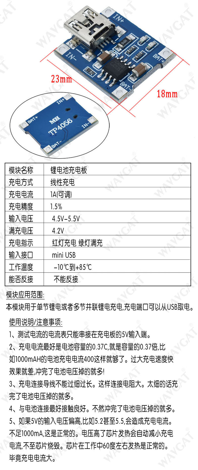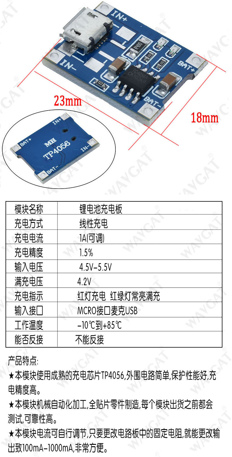 TP4056 Зарядка источника модуля платы 1A Литиевый аккумулятор и защита интегрированной защиты от перегрузки Micro/Mini Interface