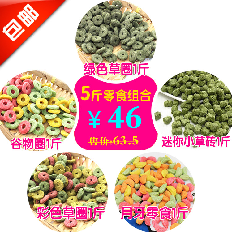 [商品内容:][绿色牧草草圈1斤+彩色牧草草圈1斤+膨化谷物草圈1斤][+四色月牙零食1斤+小草砖1斤]