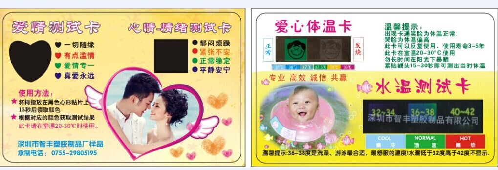 Shenzhen Zhifeng Plastic Products Co., Ltd. -это высокотехнологичное предприятие, посвященное исследованиям и разработкам, производству и использованию специальных функциональных материалов. Органическое слияние пластиковых ремесел.В области ремесленной печати используйте изменение цвета мудрости, чтобы отметить различные изменения условий окружающей среды, чтобы различные цвета могли показать их особое значение, такие как изменения температуры тела, изменения в настроении, изменения эмоции, изменения в давлении и изменения в Температура ... ... ожидая более десяти лет, компания предоставила десятки тысяч отечественных и иностранных компаний с высоким качественным жидкокристаллическим цветом термометров, цветных карт, цветовых пластиковых продуктов и других новых подарочных настроений, Любовь эмоциональная испытательная карта применима к мировой технологии измерения температуры, тока температура отображается с помощью изменений цвета. Измерение точное, показания очевидно, интуитивно и удобно. Как правило, температура может быть измерена примерно за 15 секунд. Повторно используется. Станьте продуктом, производимым в соответствии с креативностью клиентов, или печатайте рекламный контент компаний или продуктов клиентов на карте, в качестве рекламного рекламного подарка, чтобы расширить популярность предприятий и его бренда.