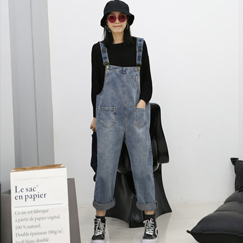 Комбинезон, джинсовые штаны, большой размер, в корейском стиле, свободный прямой крой, оверсайз, 2020, эффект подтяжки