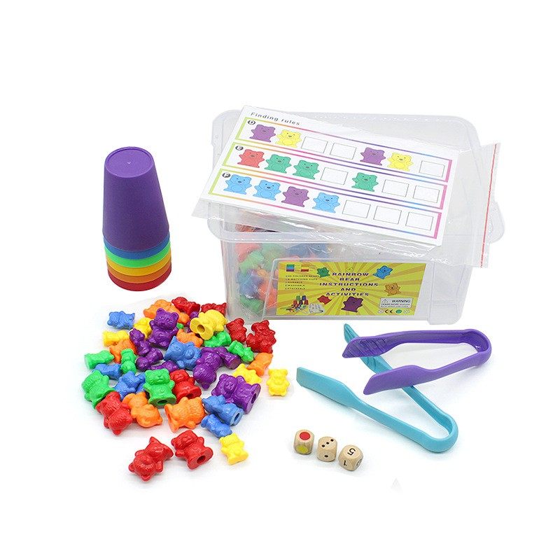 Установите 2: 120 штук шестицветных медведей третьего цифра, 2 пинцета, 3 кубика (цвета, цифры, точки), 6 радужных чашек и 15 больших карт в наборе.