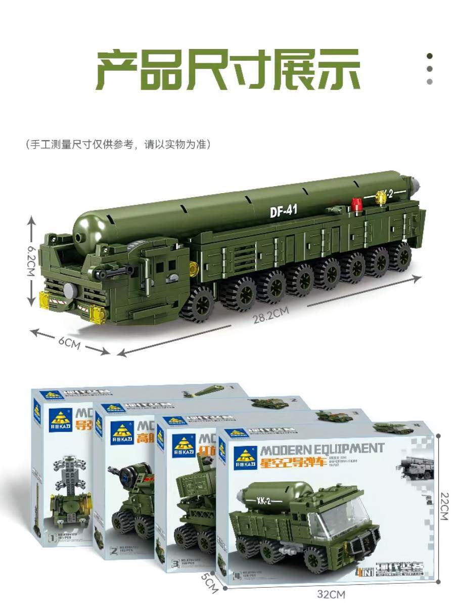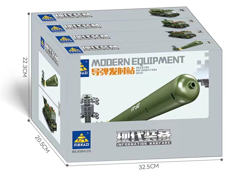 | Цвет: | [Ракетная пусковая станция] 101 частица, [Зенитная зенитная машина] 182 частицы, [Ракетная машина Хунци-6] 160 гран, [Ракетный корабль «Сингконг-2»] 129 частиц, [4-в-1 Dongfeng 41] 4 коробки по 572 частицы |