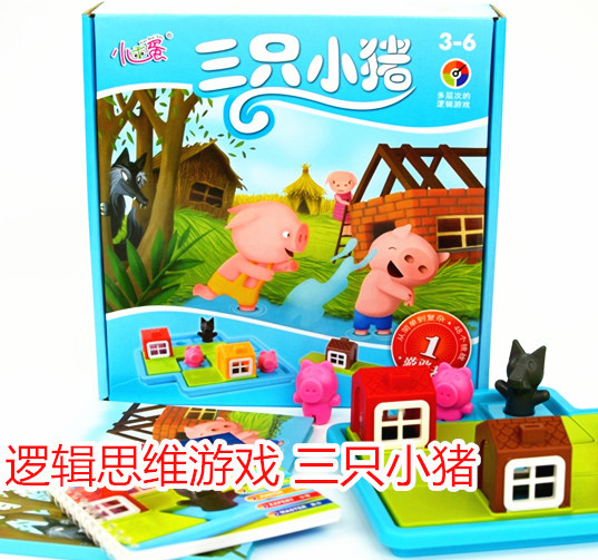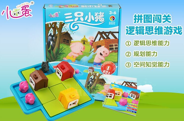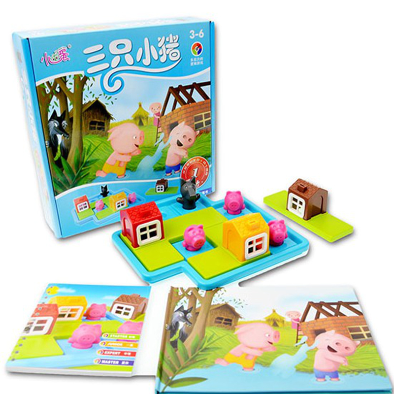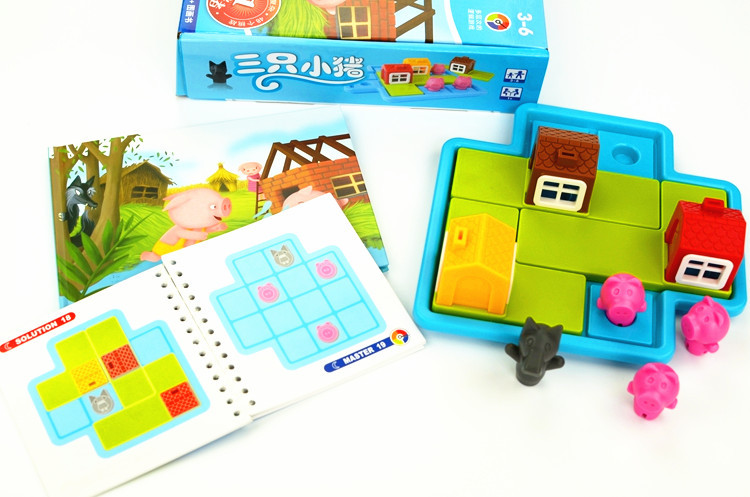 Содержит аксессуары: 1 основание, 3 штуки панелей с домами, 3 поросят, 1 волк, 1 книжный альбом (48 уровней с ответами), 1 цветовая книга рисования и рисования