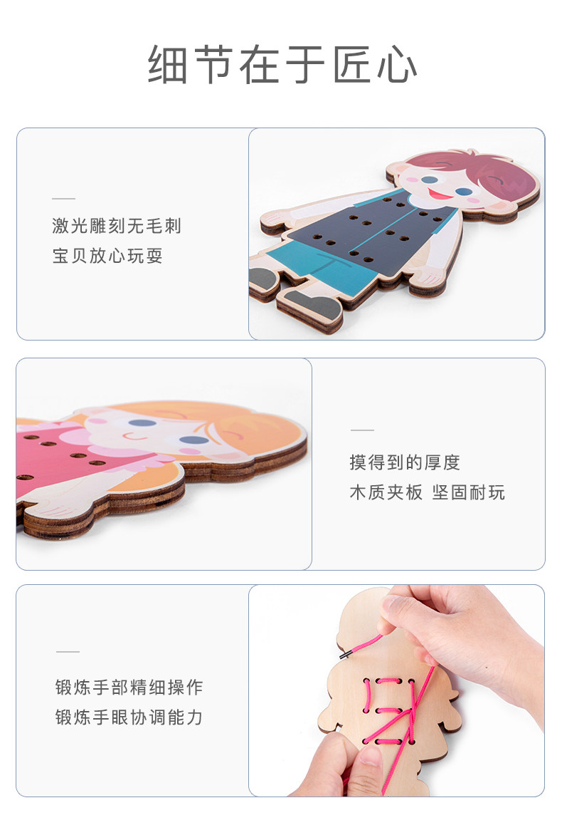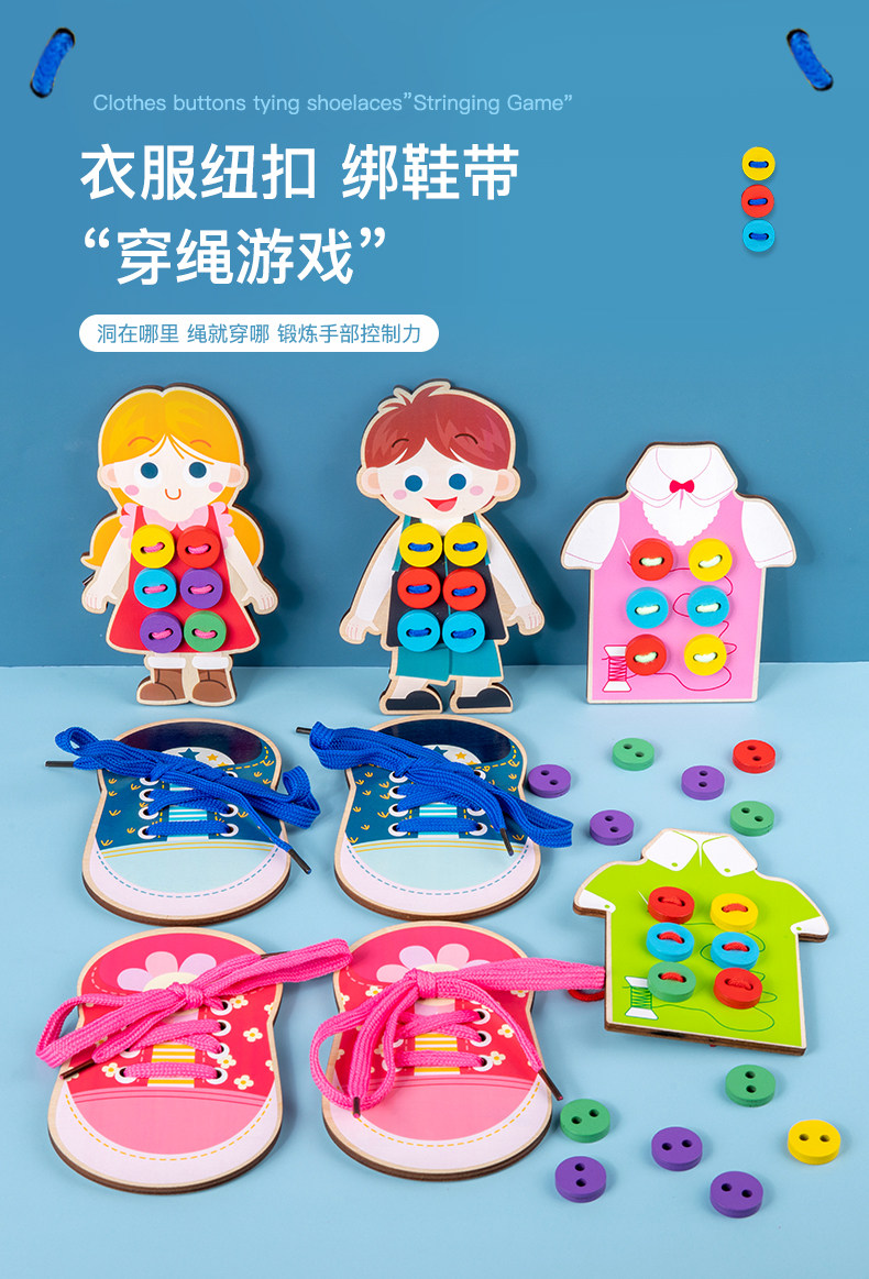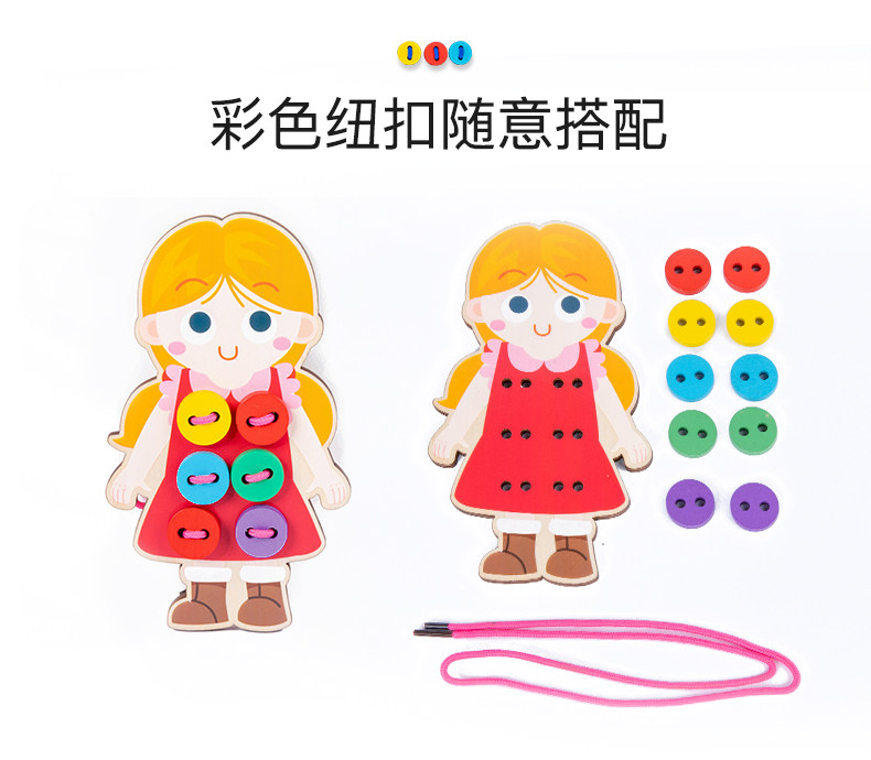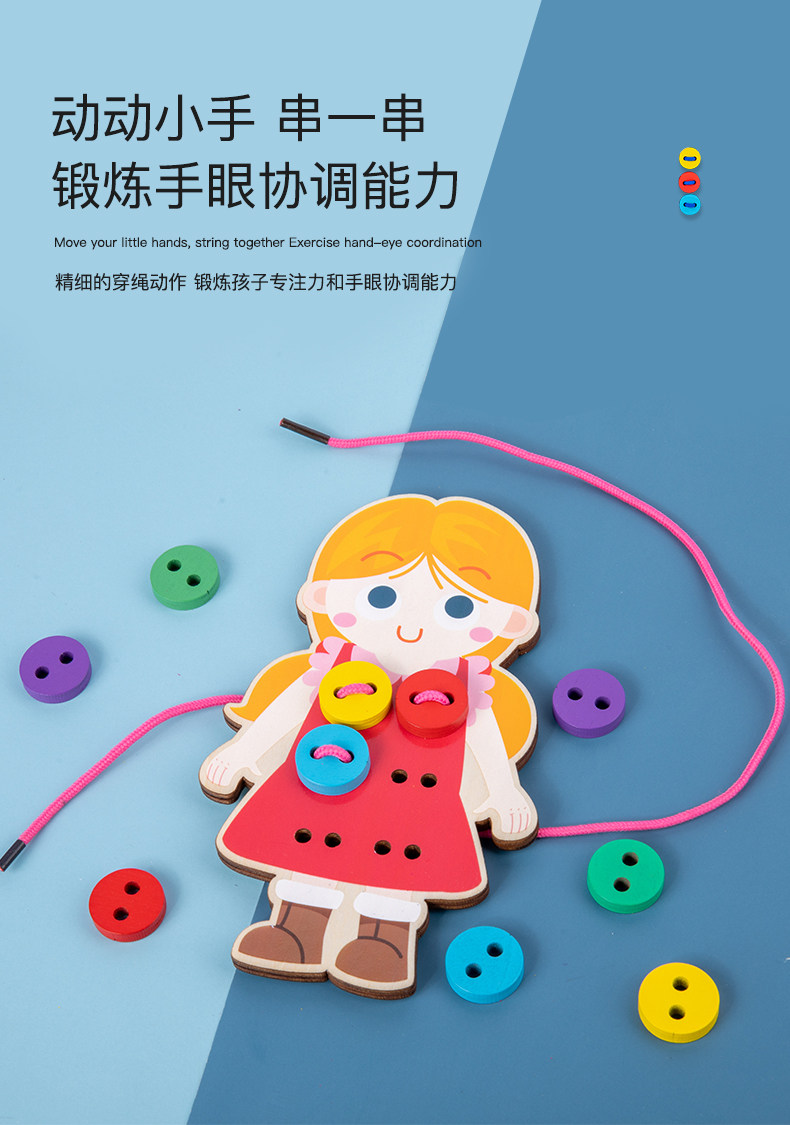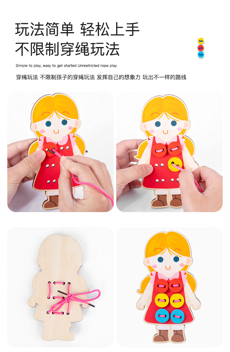 Montessori Wood Portrait носит одежду с одеждой с пряжками.