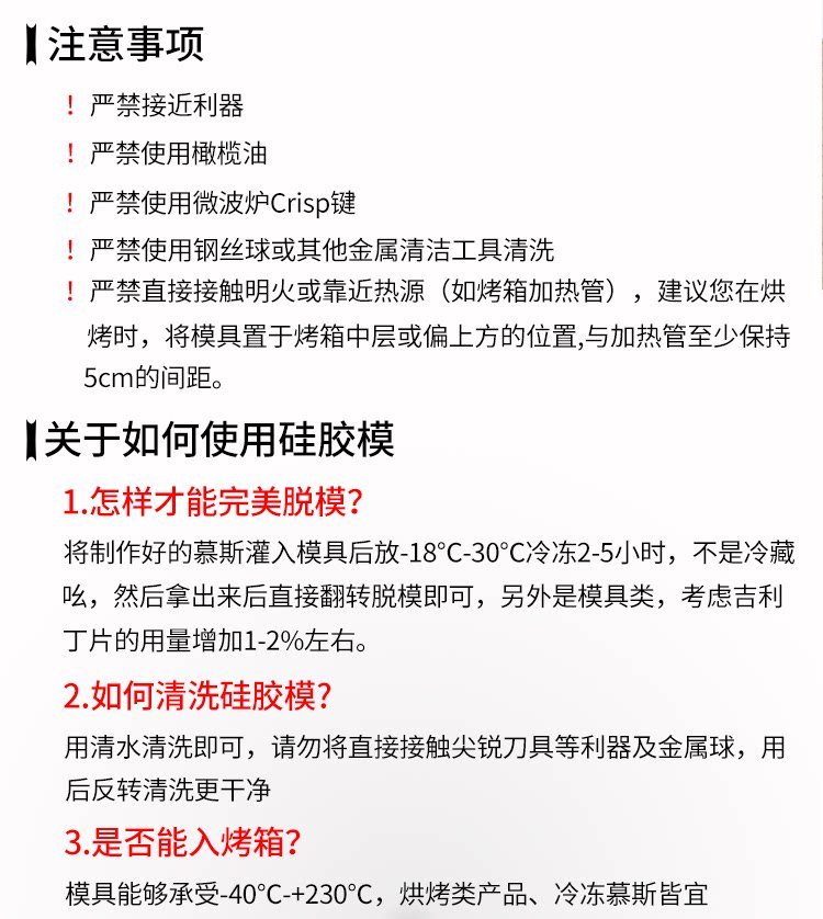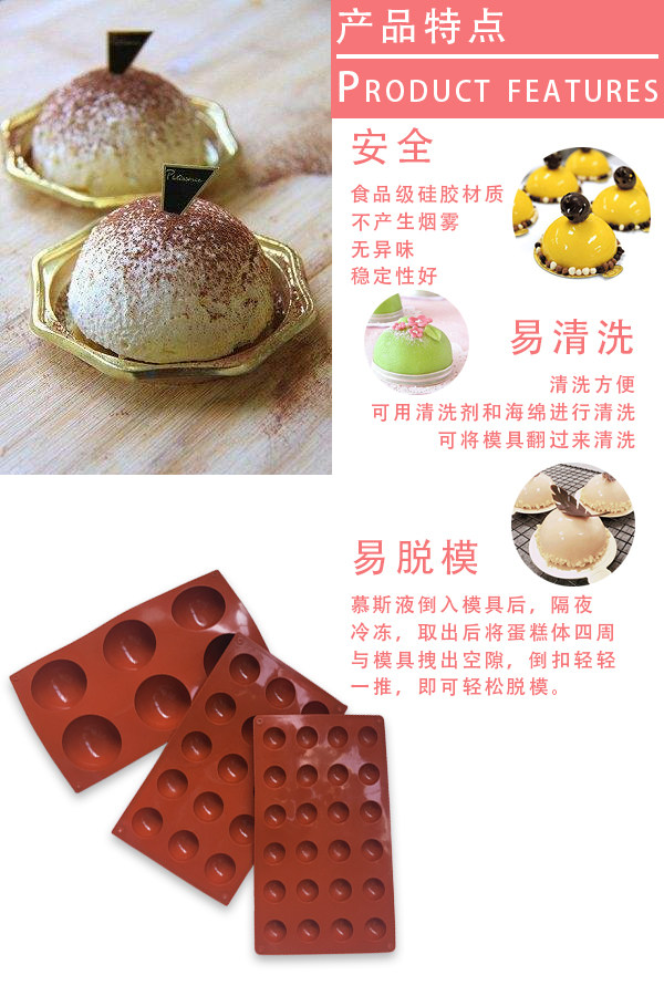 Описание продукта: безвкусная, неоксичная, пылеостойкость, долговечная, не проникающая, легко чистить.Его можно безопасно использовать в духовке, микроволновой печи, посудомоечной машине и холодильнике.Подходит для приготовления мусс -пирожных, шоколадных конфет, кубиков льда, желе, кондиционирования пищи, украшения торта, мыла ручной работы и т. Д.