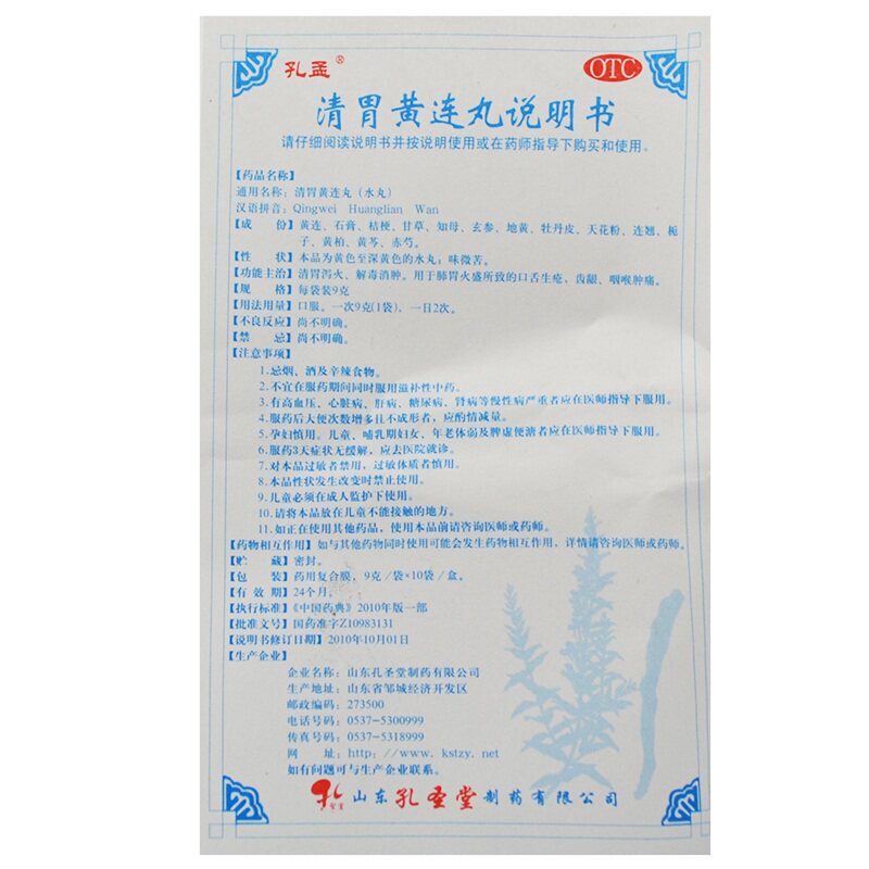孔孟 Таблетки Qingwei Huanglian 9 г * 10 пакетиков для очистки желудка, устранения пожара, детоксикации и уменьшения отека, язв во рту и языке, отека и боли в горле и деснах F