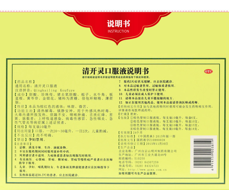 白云山 Цингкайль пероральная жидкость 6 Инфекция верхних дыхательных путей Вирус горла Холодный седация и гипертерма и гипертерма