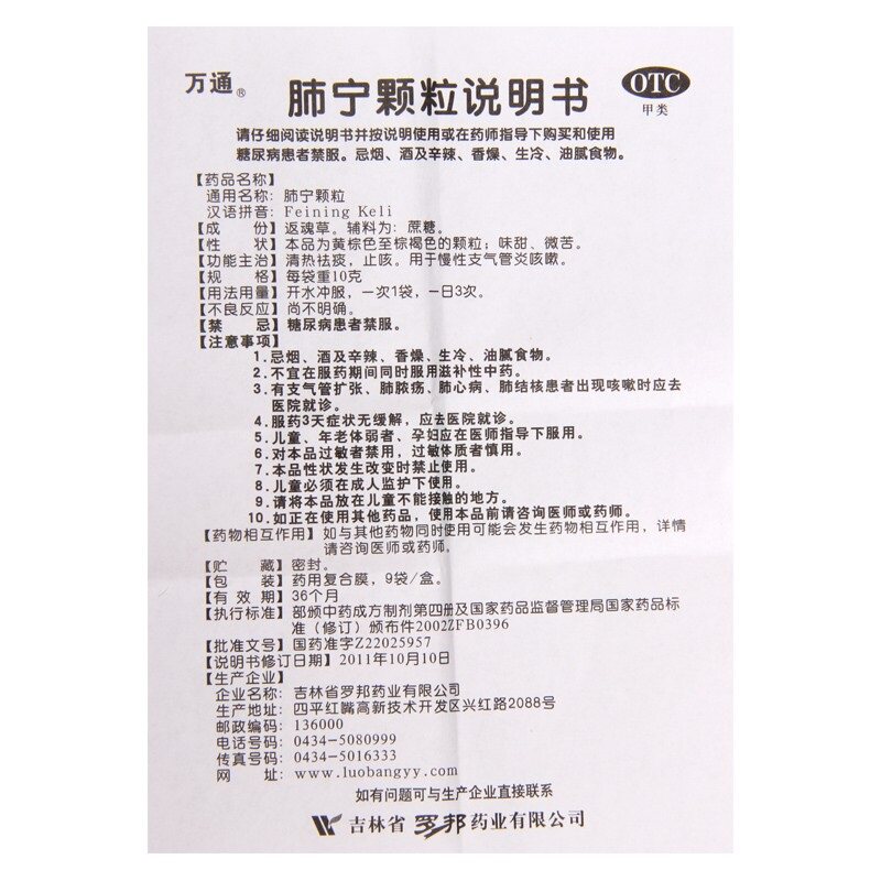 万通 Гранулы легких Ning 10G*9 мешков очистки травяные облучения и кашель хронический бронхит кашель YP