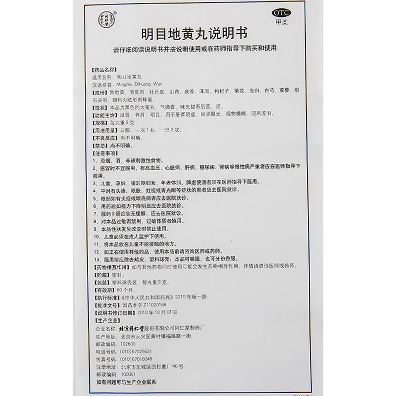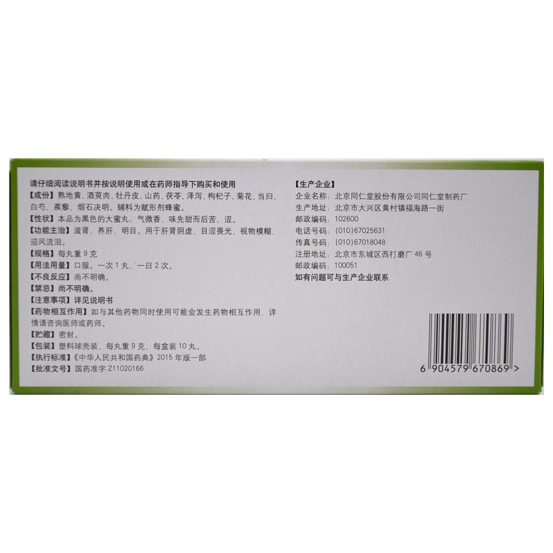 同仁堂 Mingmu Dihuang таблетки 9 грамм*10 таблетки, дефицит почек печени, почек, питательница почек, печень, зрение.