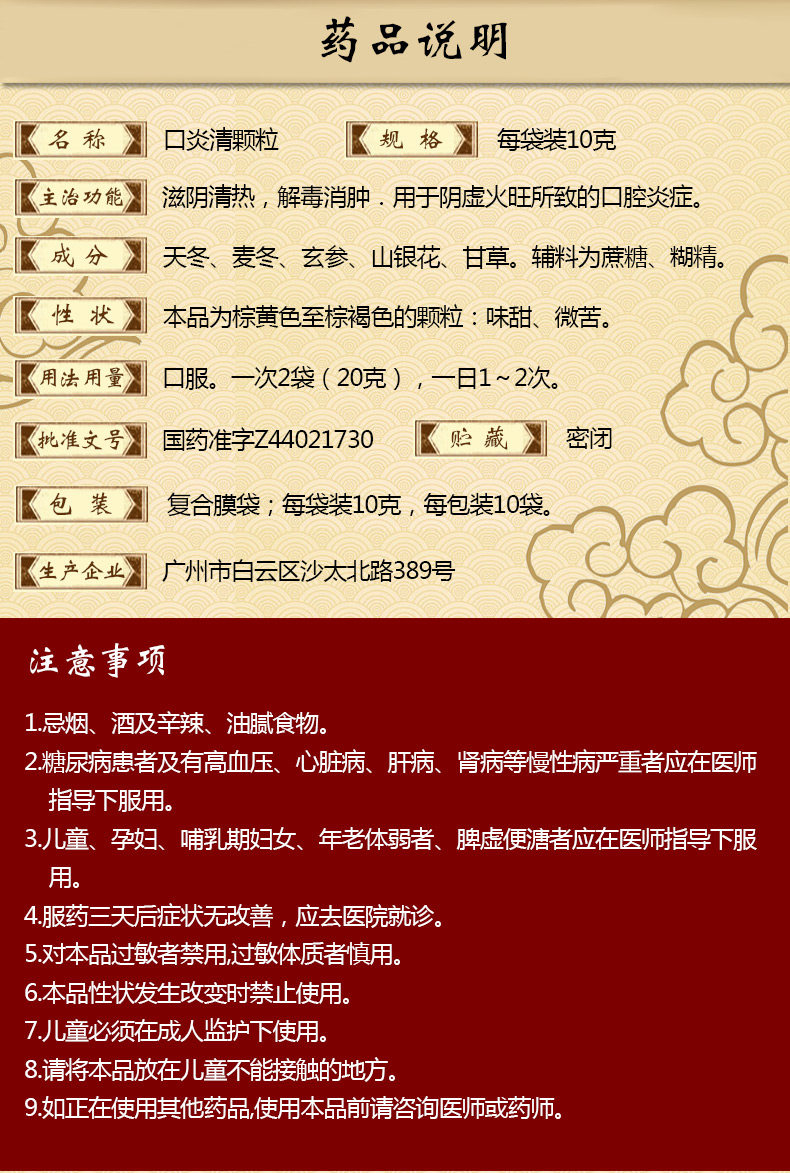 白云山 Воспаление во рту гранулированные гранулы 10G*10 мешков инь, прозрачное тепло, детоксикация, отек, инь, виртуальный огонь, воспаление губной помады