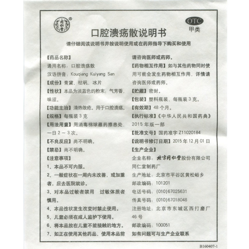 Пекинг Тонгрентанг Пероральная язва рассеянный 3G*6 бутылок очистки тепла и сближения, используемых для пероральных язв для подлинного медицины