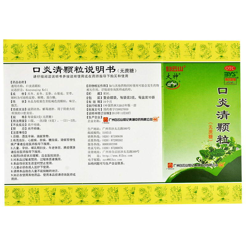 Baiyunshankou Yan Qing гранулы без сахара 10 пакетов питательны инь, очищающие детоксицидную судьбу, сердечная принятие зубной боли препараты