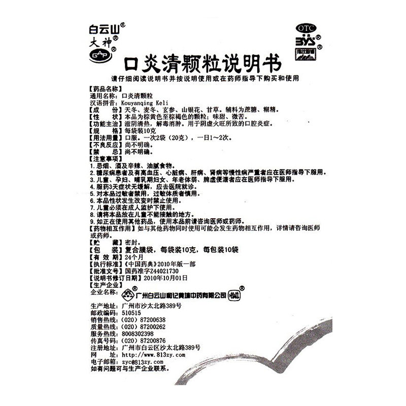 白云山 Воспаленные частицы во рту 10 г*12 мешков, отек, детоксикация, огонь дефицита Инь, воспаление язвы во рту, гнилый во рту угол рта