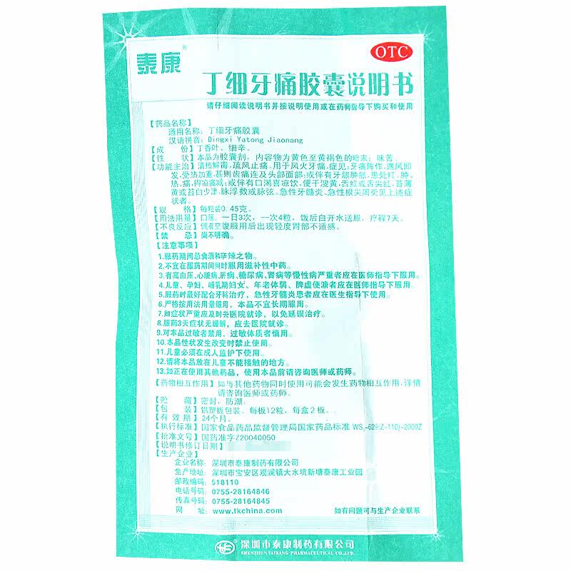 泰康 Ding Xieya Зубная боль в 24 капсулы