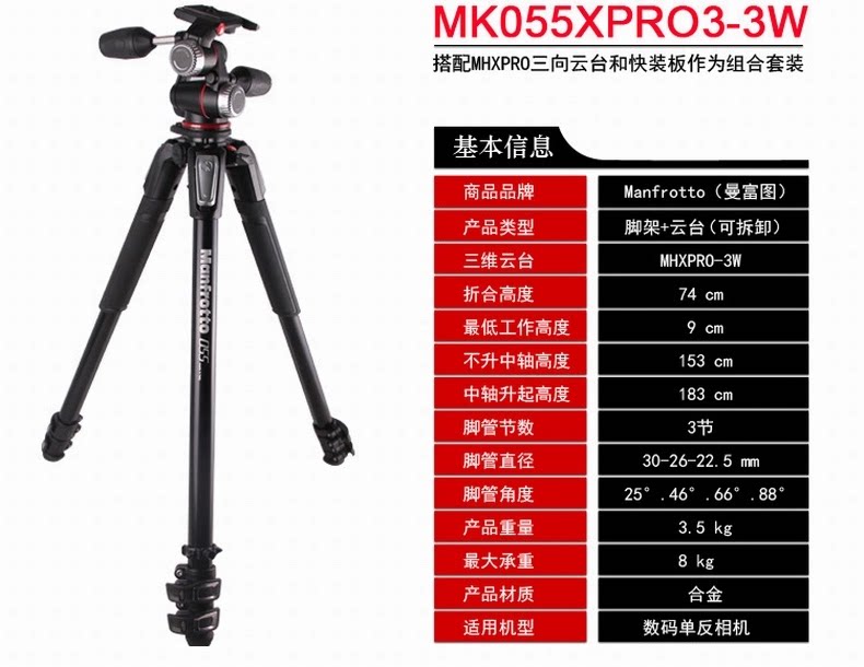 Manfu Manfrotto MK055XPRO3-3W Алюминиевый сплав набор сплава составляет 8 кг.