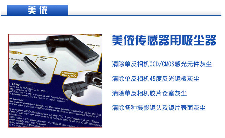 Meibon Special Vacuum Cleaner использует двойной способ очистки и вытирания пыли.Поскольку датчик легко прикреплять пыль, он вызван статическим зарядом.Следовательно, датчик Mi Nong использует чистящую среду пылесоса, чтобы использовать высококачественные мягкие резиновые материалы.Самым большим преимуществом резины не является статический заряд, а резина с высоким качеством является мягкой и гладкой и не вызывает повреждения поверхности датчика.Вытирая датчик, пылесос мгновенно разряжает пыль в организм, тем самым избегая вторичного загрязнения, вызванного датчиком.Meinon Sensor использует пылесос для проезда с помощью батареи 5#AA, что удобно для переноски подходящего для использования в различных случаях. Основной принцип работы вакуумного чистящего средства; в вакуумном чистке существует эффективная и способная турбина вентиляционной вентиляции полим.Внешняя турбина представляет собой воздушную крышку.Турбина вращается на высокой скорости на работе и взаимодействует с выпрямителем.Из -за влияния разности давления поток вращения воздуха образуется на поверхности датчика, а вращение воздуха непосредственно нарушает пыль, прикрепленную к поверхности датчика.Окисляющий слой на поверхности датчика был очищен сначала под головкой кисти, а затем в вакуумное очиститель вдыхали в вакуумное очиститель.После выпрямителя и расширенной трубки он был исключен на высокой скорости.Требуется всего 10 секунд, чтобы очистить весь процесс очистки! Датчик Mie Nong может быть применен к цифровым камерам SLR, микроструктурам, одноэлектрическим камерам датчикам, складам отражателей, отражающим платам и т. Д.Он также может быть использован для поверхностной пыли линз линз, ультрафиолетовых линз и других оптических инструментов. Использование вакуумного датчика датчика Meinon Датчики Meibon оснащены двумя резиновыми головками с пылесосом.Один из них плоский, как точечное всасывание.Когда требуется большая площадь, можно использовать плоскую всасывающую головку. При очистке точки или децентрализованной пыли вы можете использовать точечную всасывающую головку. Набор пылесосов также оснащен чистой тканью и миниатюрным фонариком. В следующей ситуации вам нужно очистить датчик: Было обнаружено, что контраст экрана съемки был уменьшен, а цвет был скучным. На экране съемки есть много незаменимых точечных проекций.   Перед эксплуатацией, пожалуйста, используйте недавно заряженную батарею, чтобы убедиться, что мощность достаточно.Недостаточная мощность может привести к закрытию затвора на полпути и повредить затвор.Операционная среда должна быть выбрана в помещении, а ветряная среда нет.Чтобы предотвратить генерирование статического электричества в течение 70%.Идеальная чистая среда хороша для дождливых дней. Установите метод экспозиции камеры в качестве ручного во время работы.Установите скорость затвора, чтобы надолго выставлять B передачи.Снимите объектив и нажмите Bate B и заблокированы через линию затвора. В настоящее время отражатель поднимается и обнажает датчик.Большинство камер с высоким уровнем моды имеют режим очистки датчиков.Если у вас есть, пожалуйста, откройте режим очистки датчика. Согласно загрязнению датчика, выберите плоскую головку или сон.Включите силовую щетку для коллектора пыли и датчик, а затем вытрите ее дважды, чтобы заверш